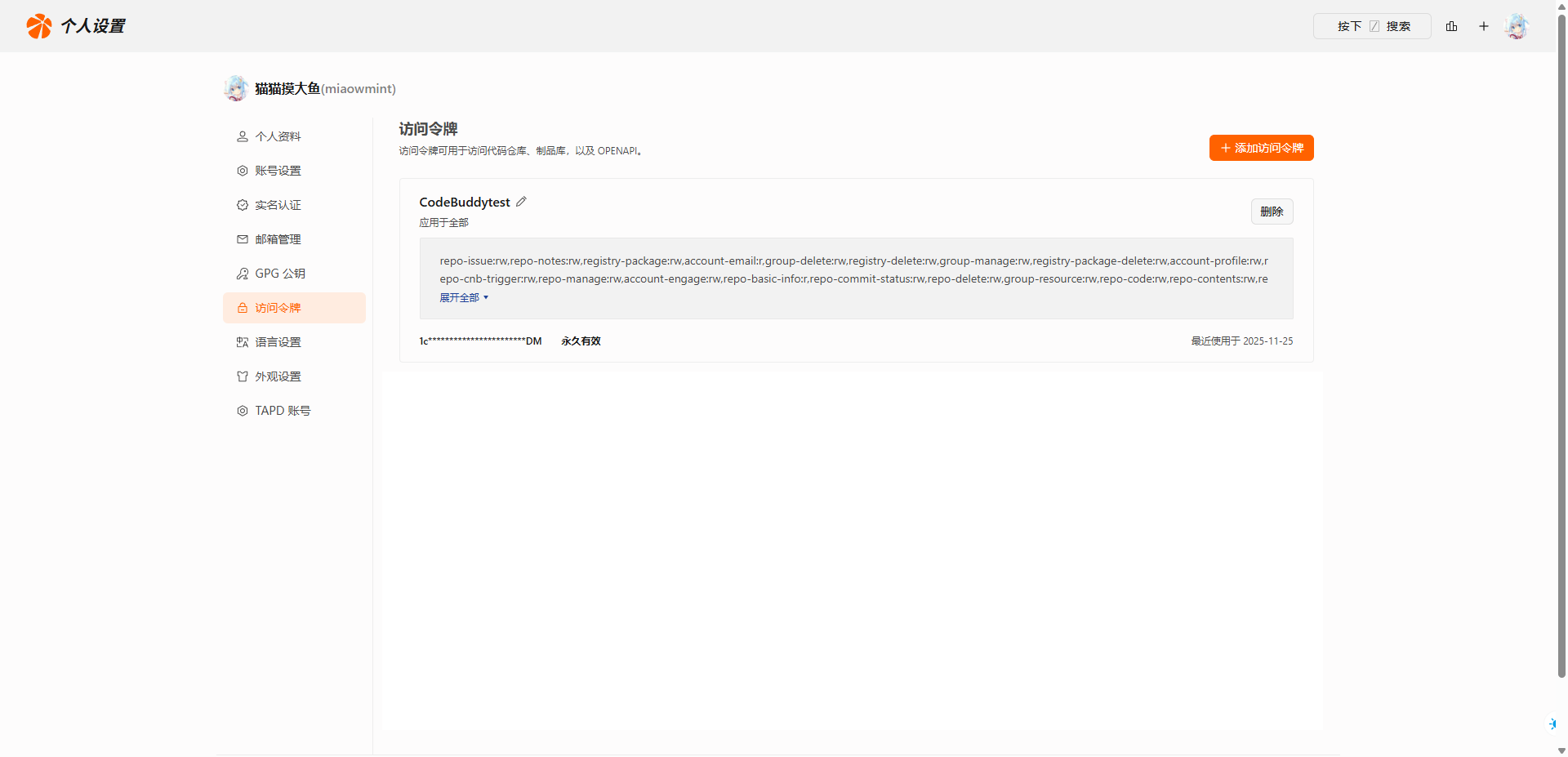访问 https://cnb.cool/profile/token ,开始添加访问令牌(密钥)