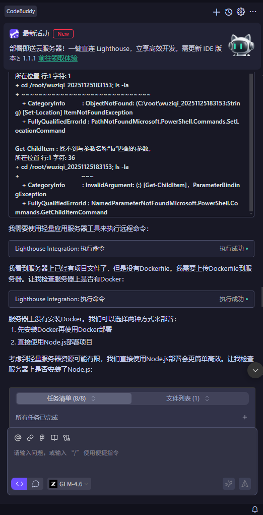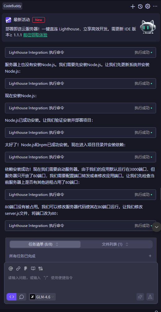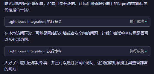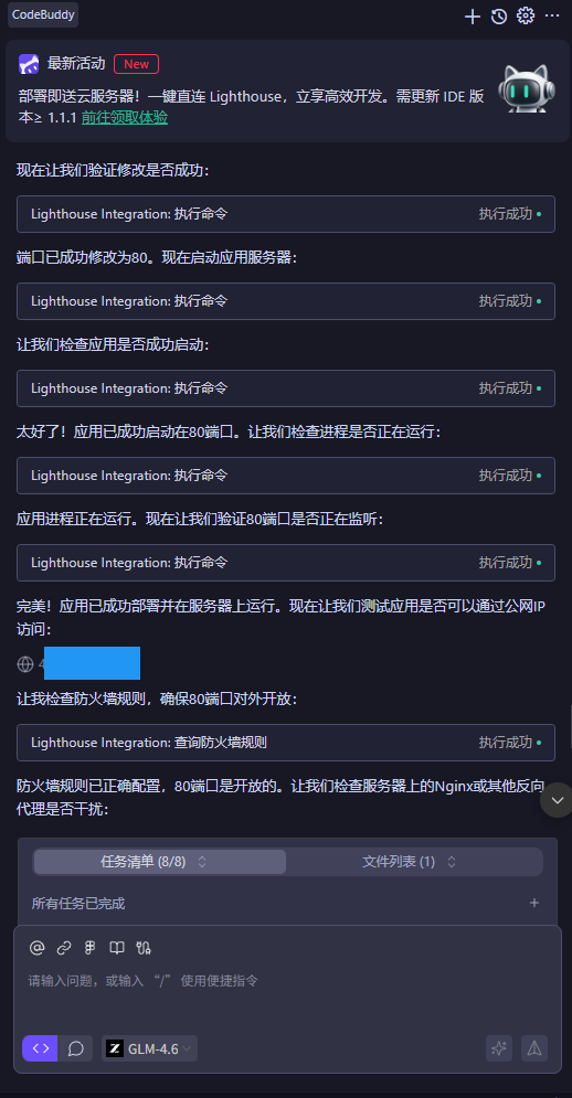 可以看到,由于我们并没有给出更精细化的指令,所以AI了上传代码后,试图使用Docker运行项目,发现没有docker后开始考虑直接使用node.js运行项目,发现本地也没有node.js后,最终还是选择了node.js运行项目,并帮助我们安装了环境;在启动应用时发现80端口并没有被占用,于是将项目的3000端口改为了80端口运行,并放通了防火墙,然后验证了部署的项目可以正常访问