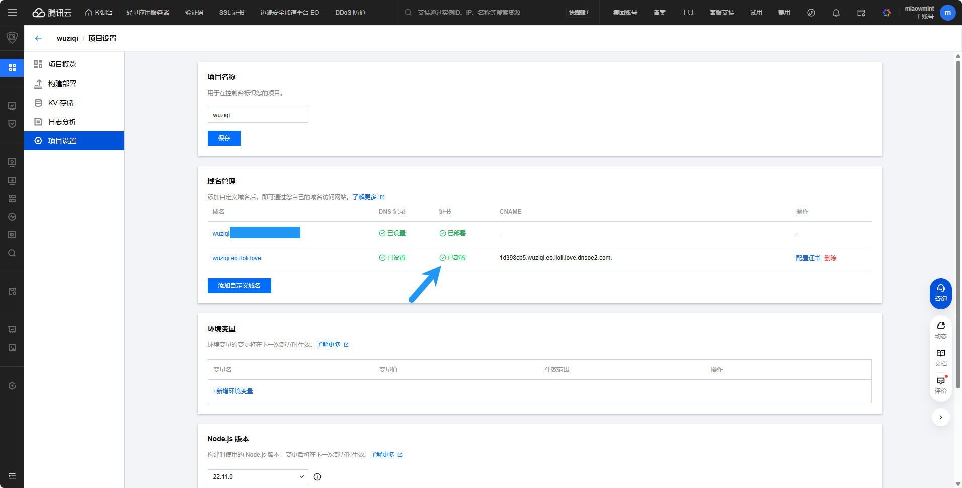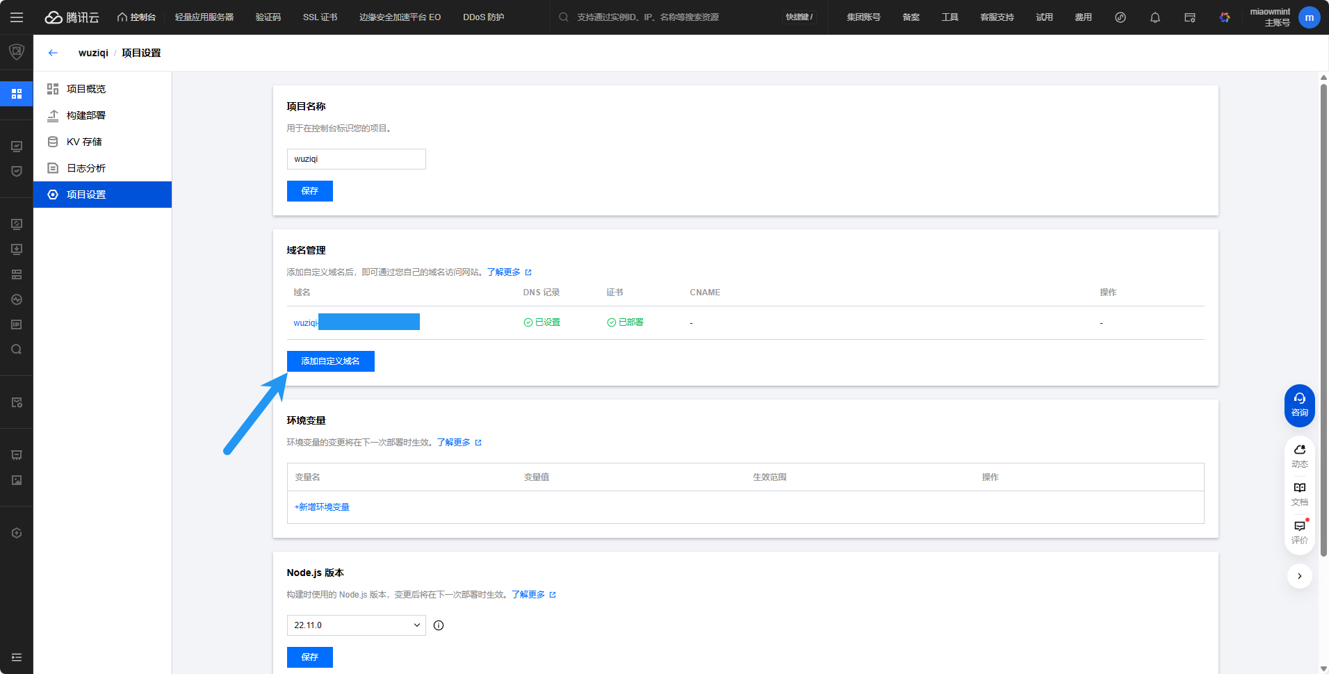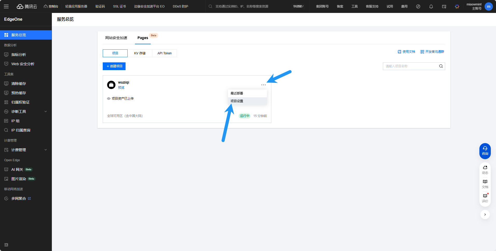 访问 https://console.cloud.tencent.com/edgeone/pages?tab=projects ,点击 更多 (···) ,项目设置