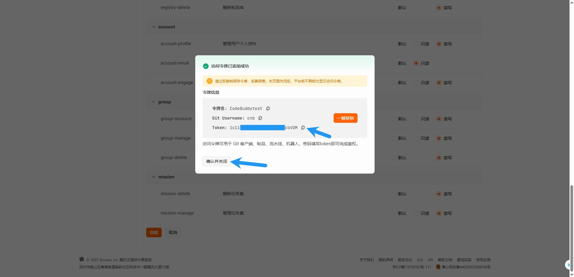 可以看到成功提示,复制保存下 Token ,点击确认并关闭