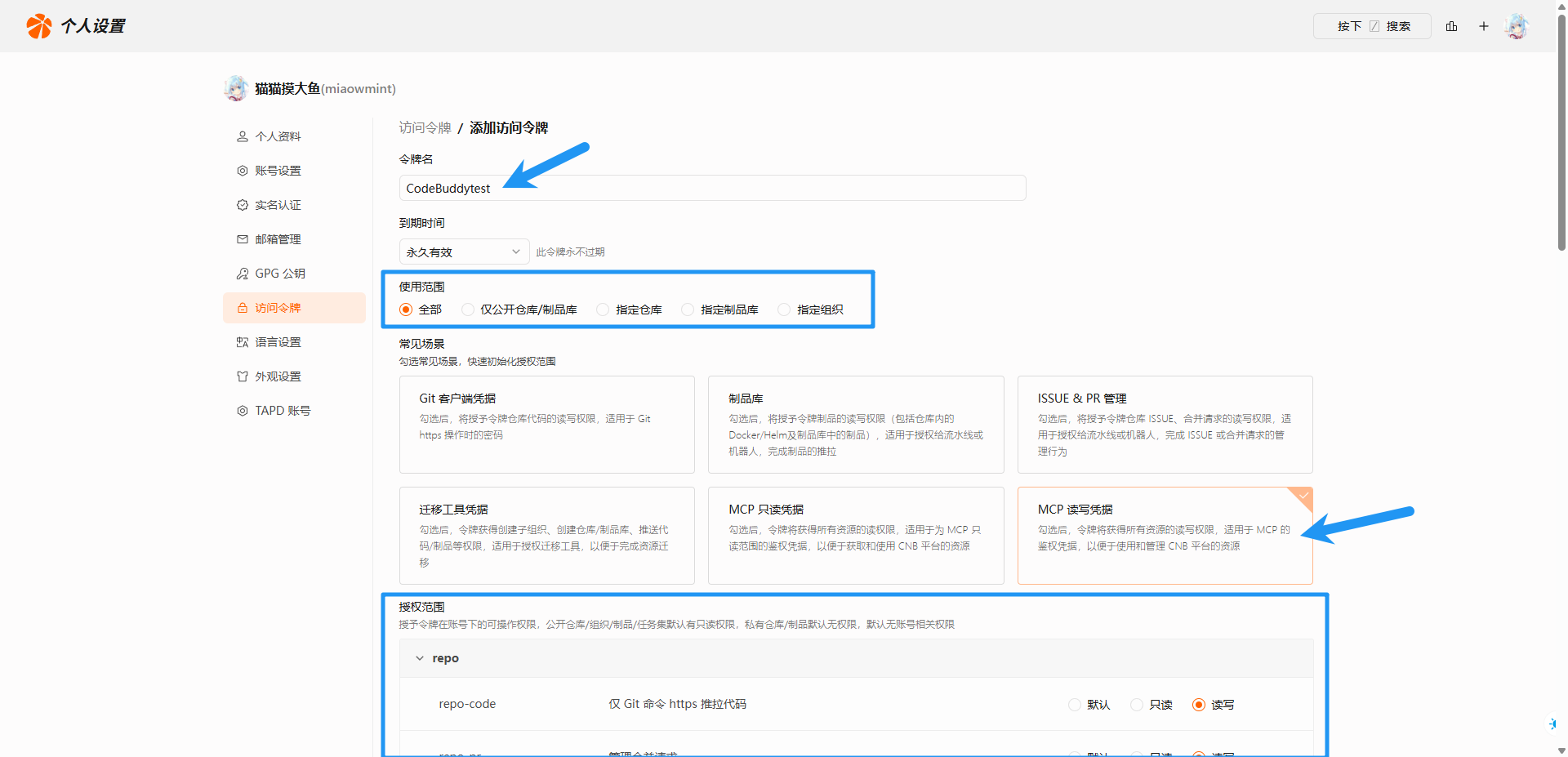 输入令牌名(随意),点击 MCP读写凭据(这样的密钥是全权限的,如果有权限方面的顾虑,可以根据自己的实际情况,精细化调整使用范围及下方的授权范围)