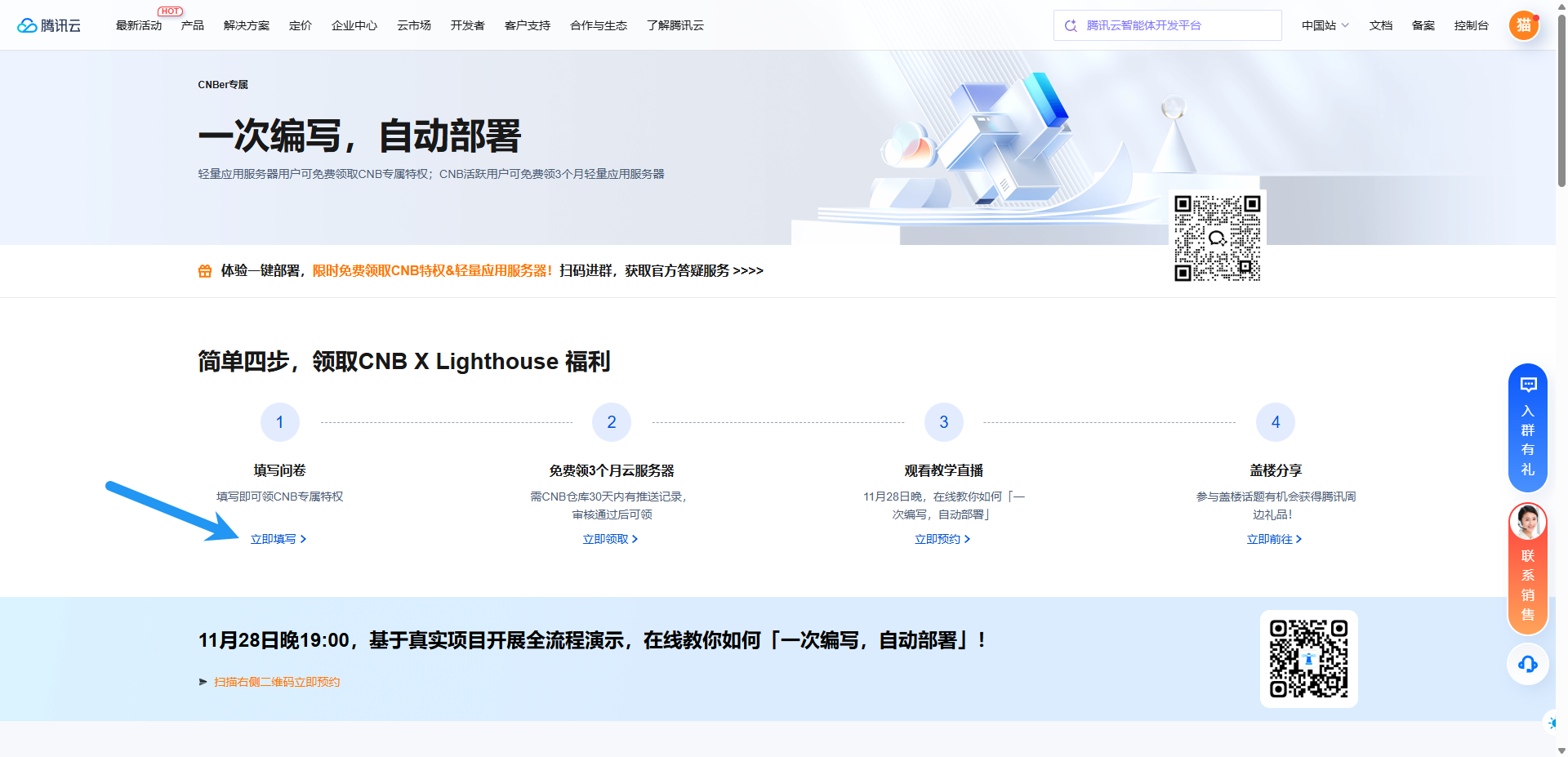 访问 https://cloud.tencent.com/act/pro/cnb-lighthouse ,点击 立即填写