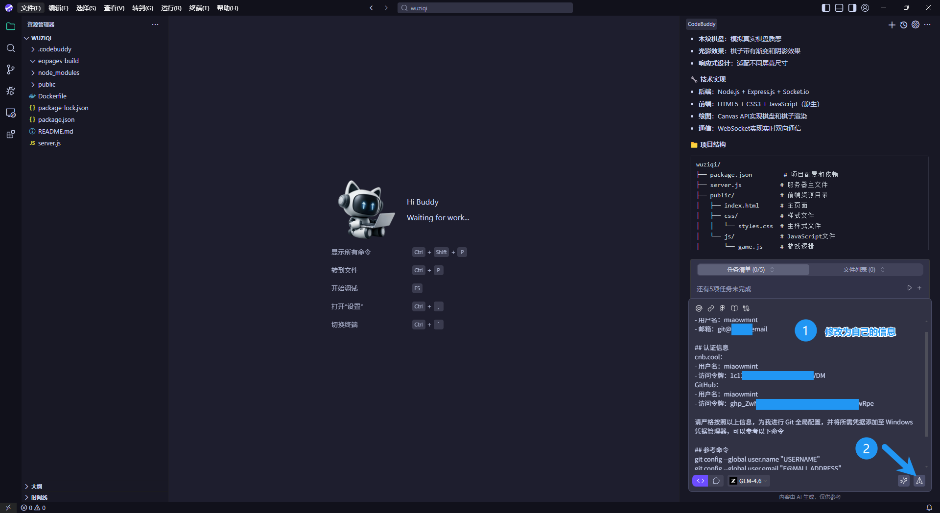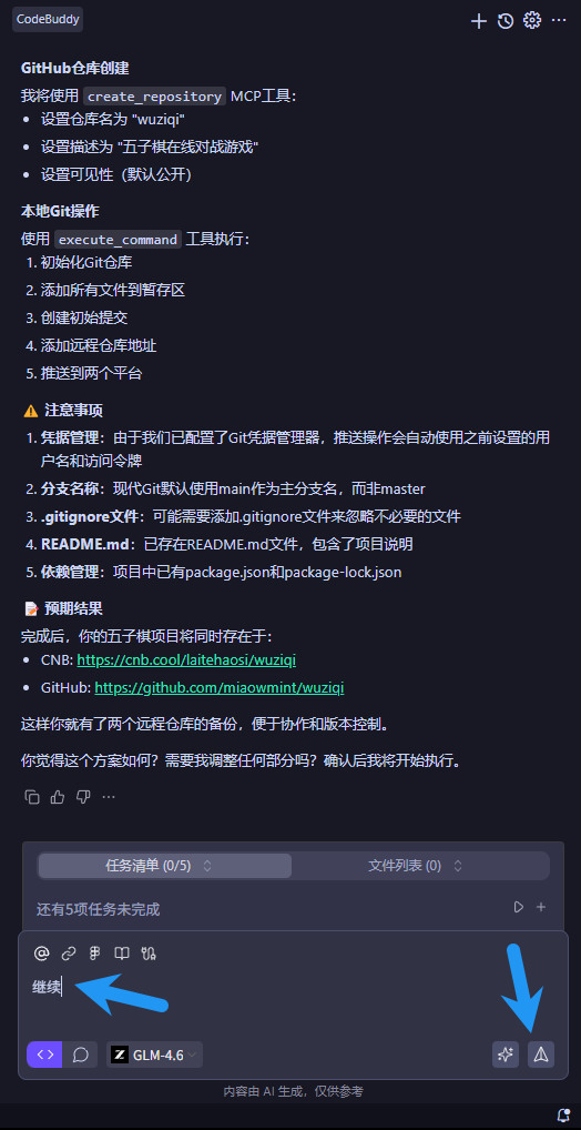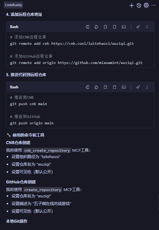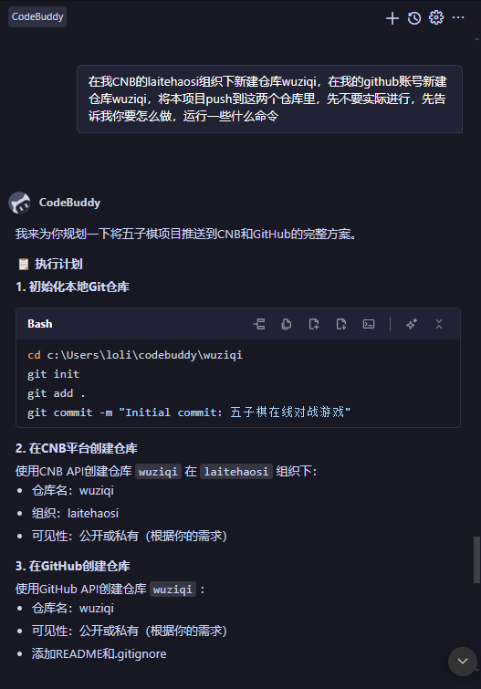 稳妥起见,我们先审计一下AI的接下来的操作有没有什么问题,向AI发送指令 在我CNB的laitehaosi组织下新建仓库wuziqi,在我的github账号新建仓库wuziqi,将本项目push到这两个仓库里,先不要实际进行,先告诉我你要怎么做,运行一些什么命令 (仅为示例,请修改为你的具体信息)