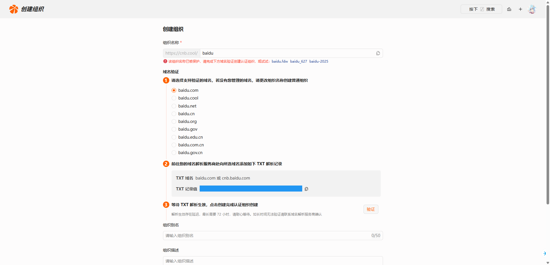 不过这里要注意,如果 你要创建的组织名称 和 一部分已被注册的域名 重叠了,那么则需要进行域名验证,例如下面这个