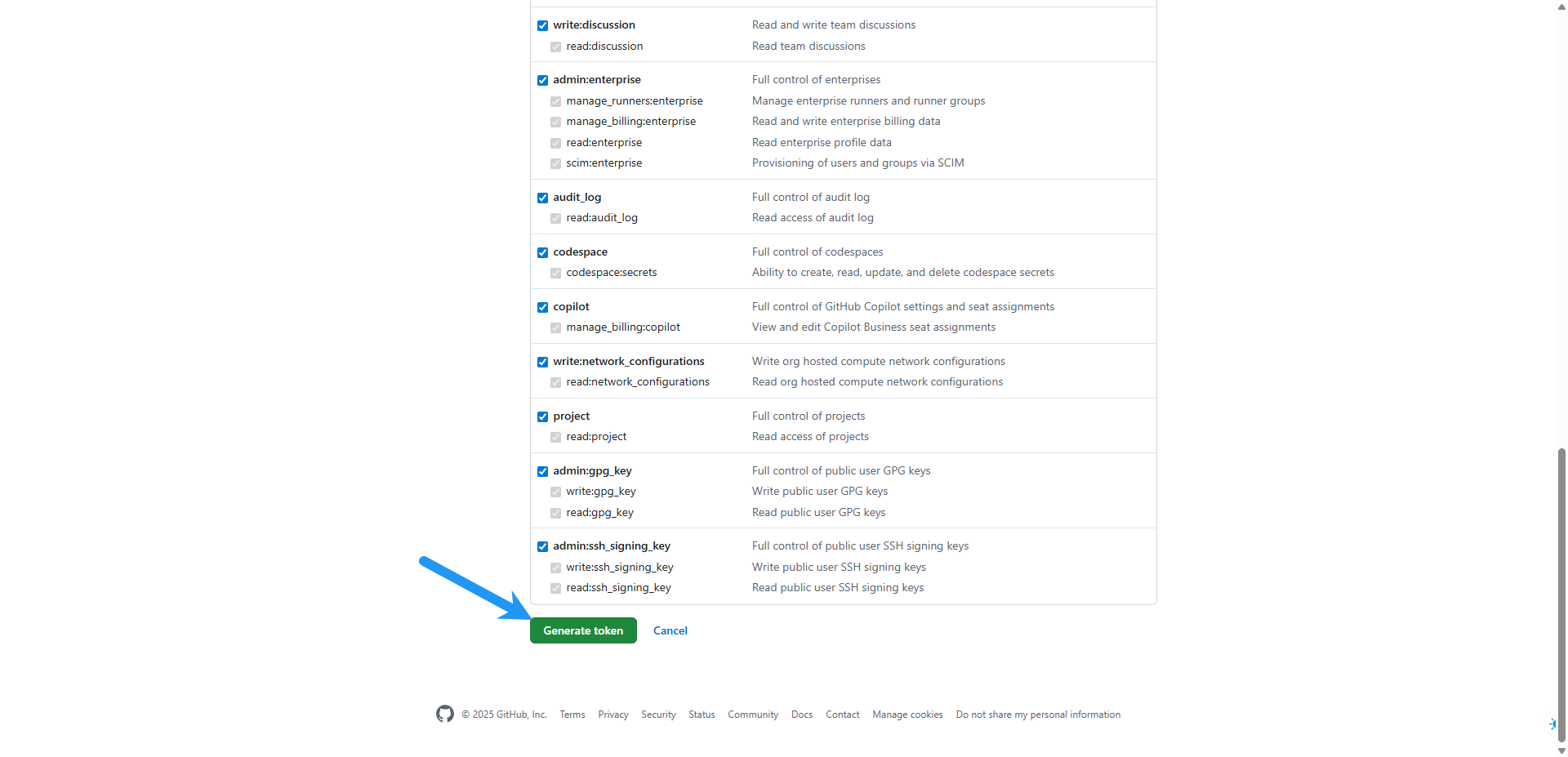 填写令牌名(随意),过期时间调整为不过期,下方的权限全部勾选上,点击最下面的生成令牌
