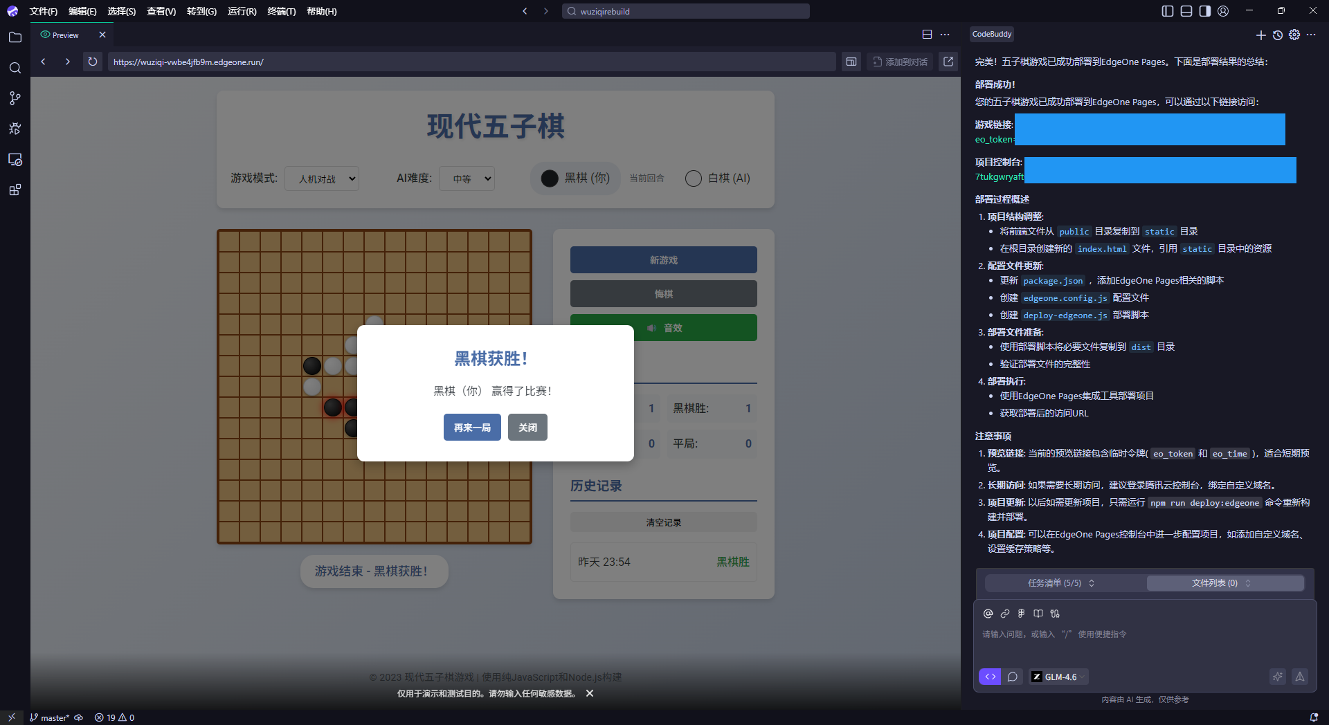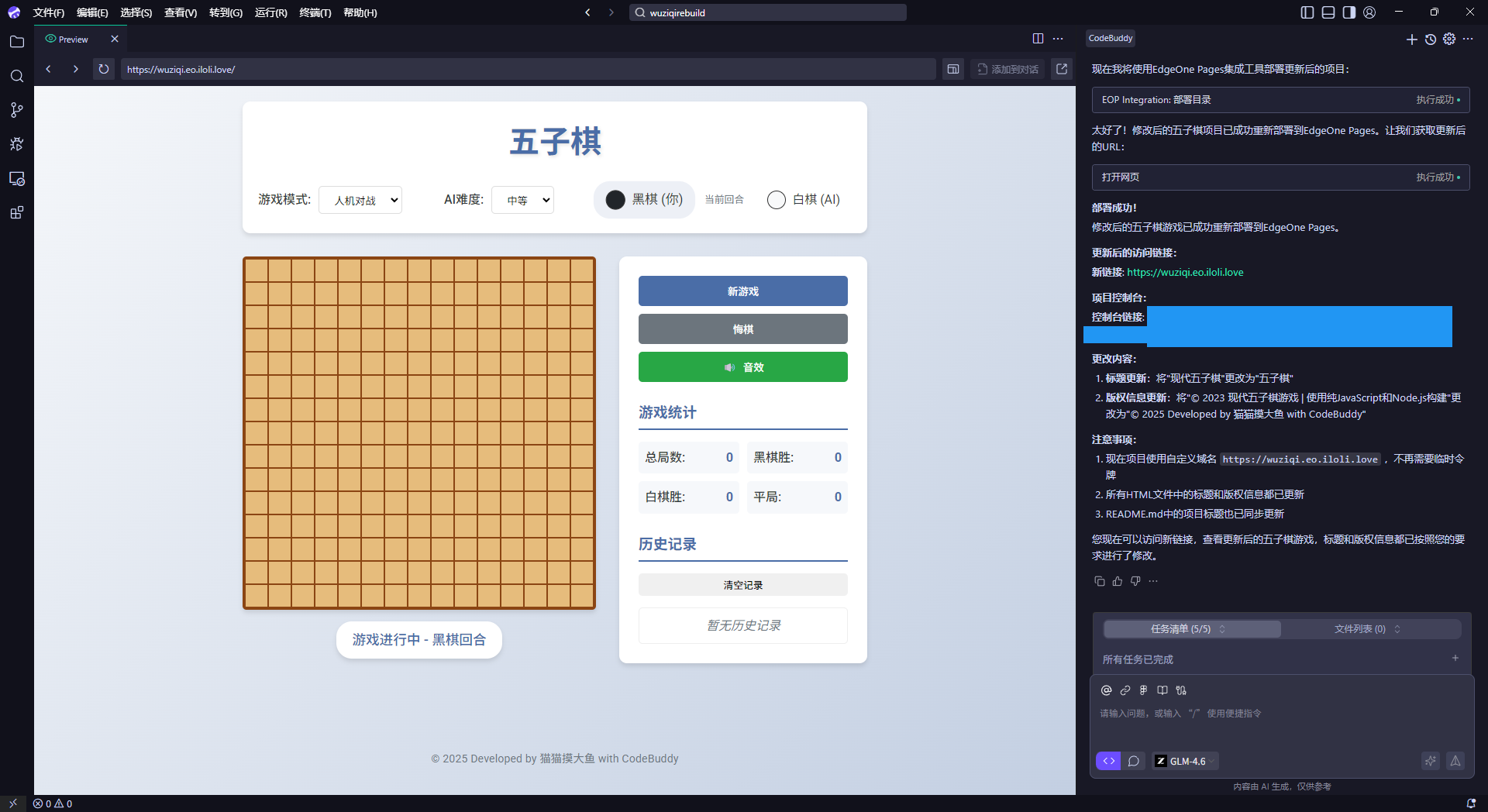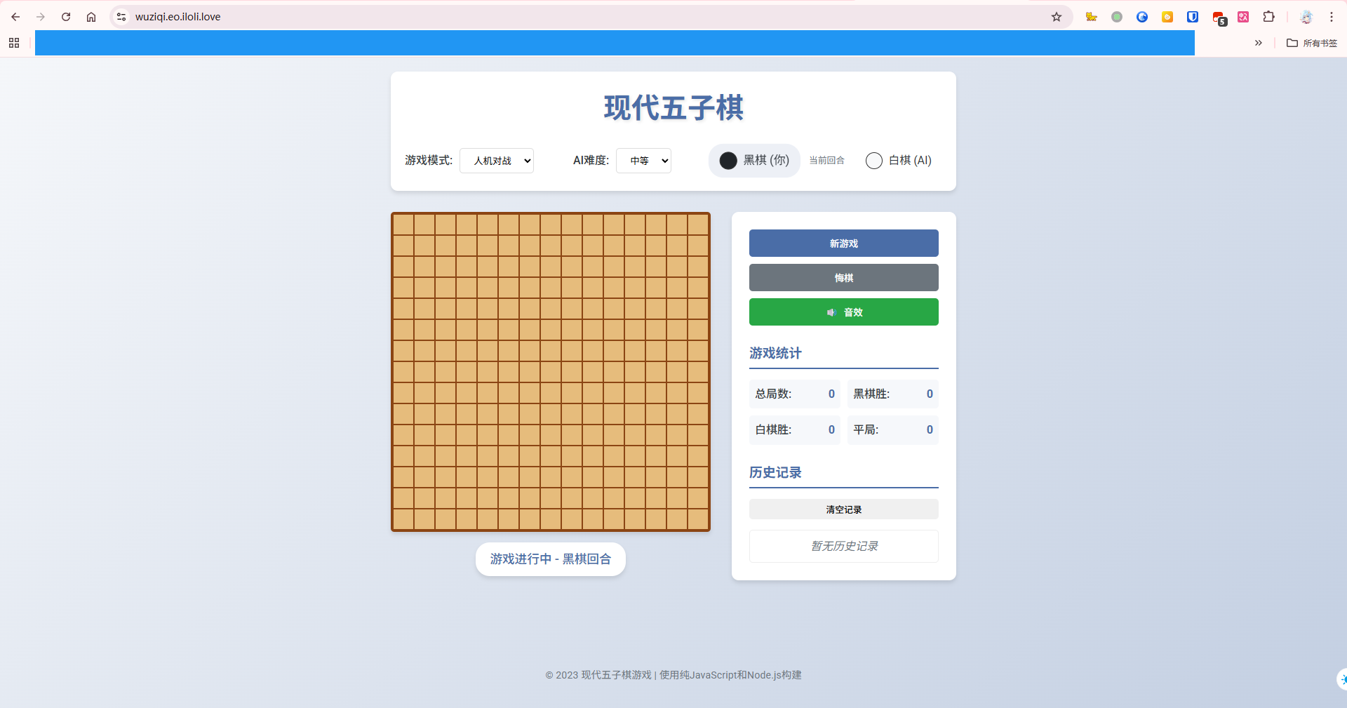 如果你也跟着我的文章部署了,那么可以访问你自己绑定的网站;或者也可以访问我部署的网站 https://wuziqi.eo.iloli.love/ ,就可以游玩刚刚写的五子棋游戏了