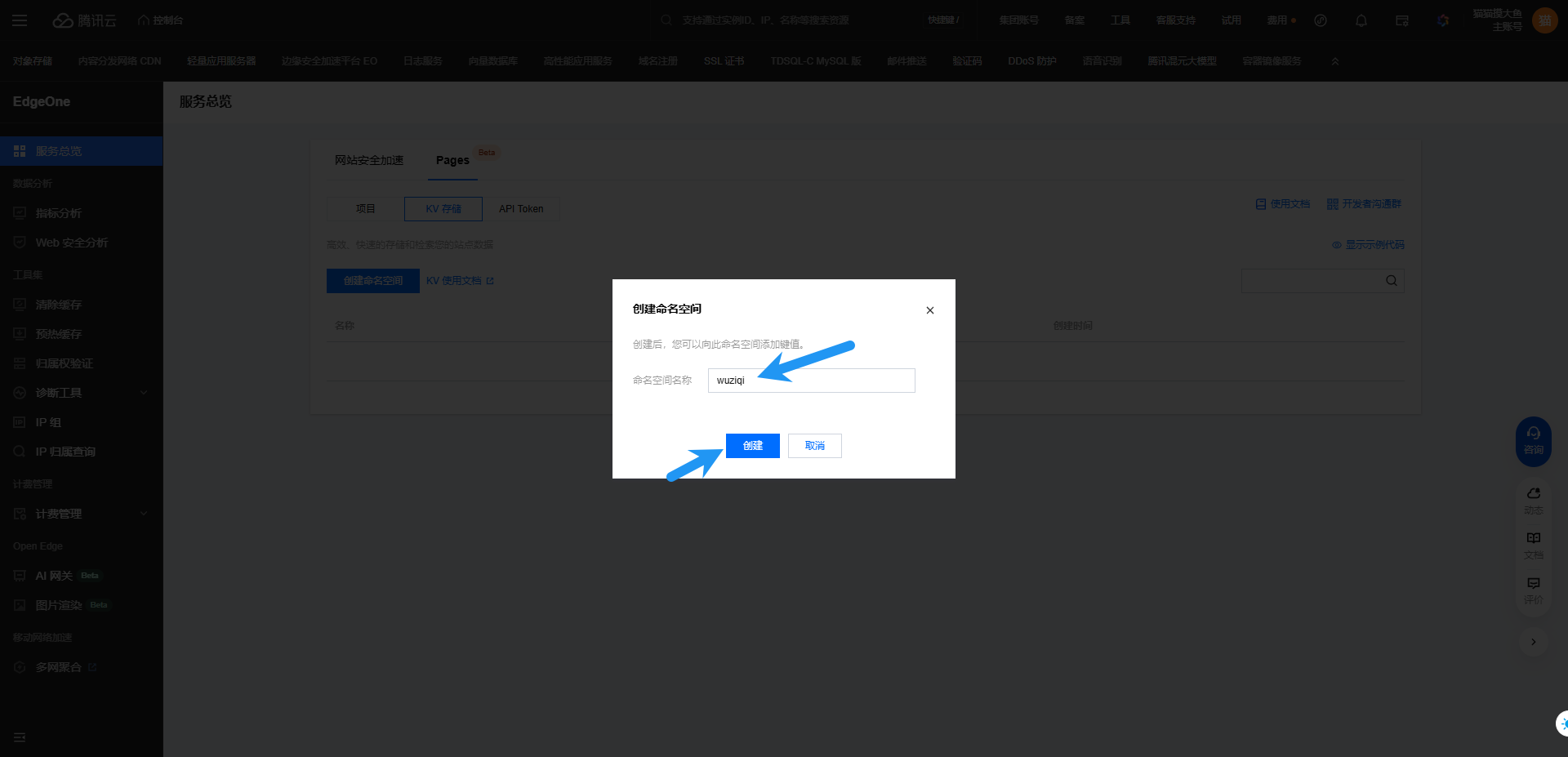 审核通过后,点击 创建命名空间 (每个 命名空间 都是一个 键值数据库 )