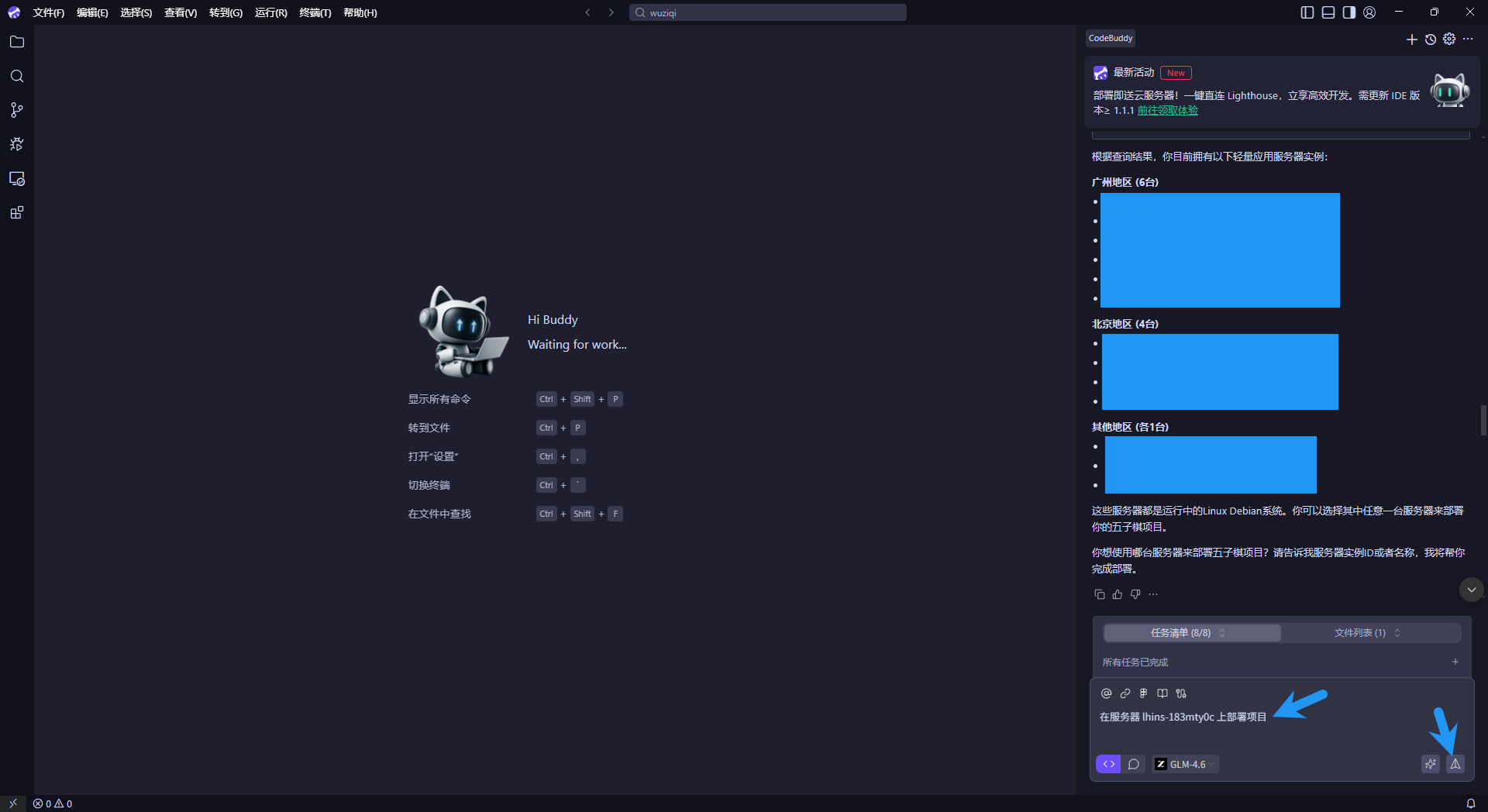 将刚刚复制的服务器ID交给AI,对AI发送 在服务器 lhins-183mty0c 上部署项目 (实践中请替换成你自己的服务器ID)