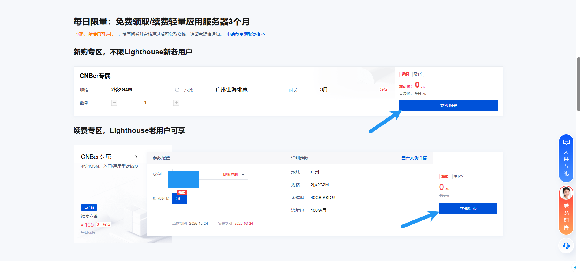 可以新购续费二选一,如果是国际版的付费用户,似乎可以同时额外新购/续费一台2C8G的机器