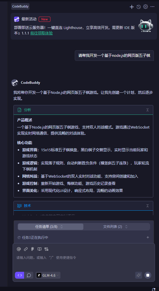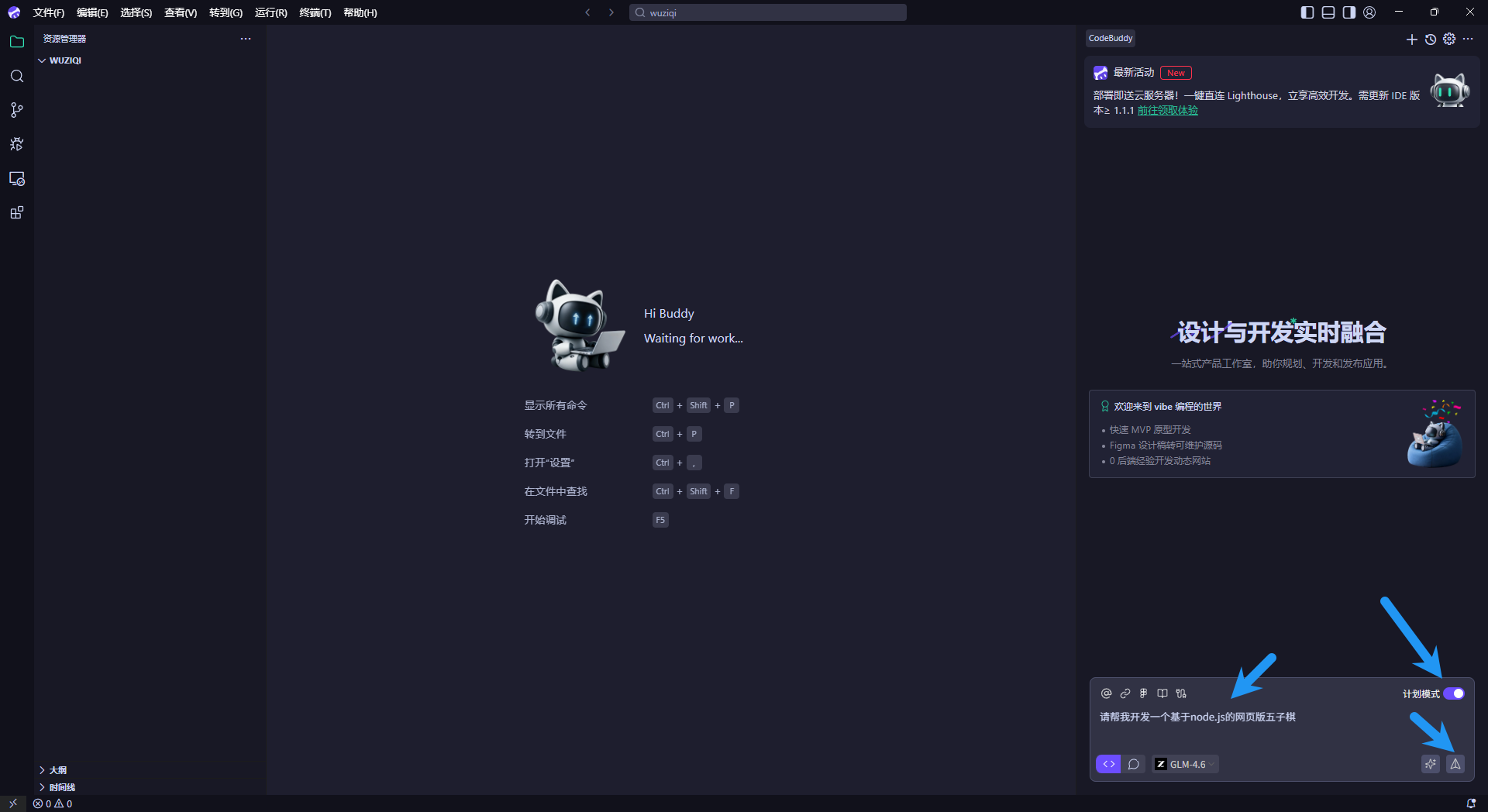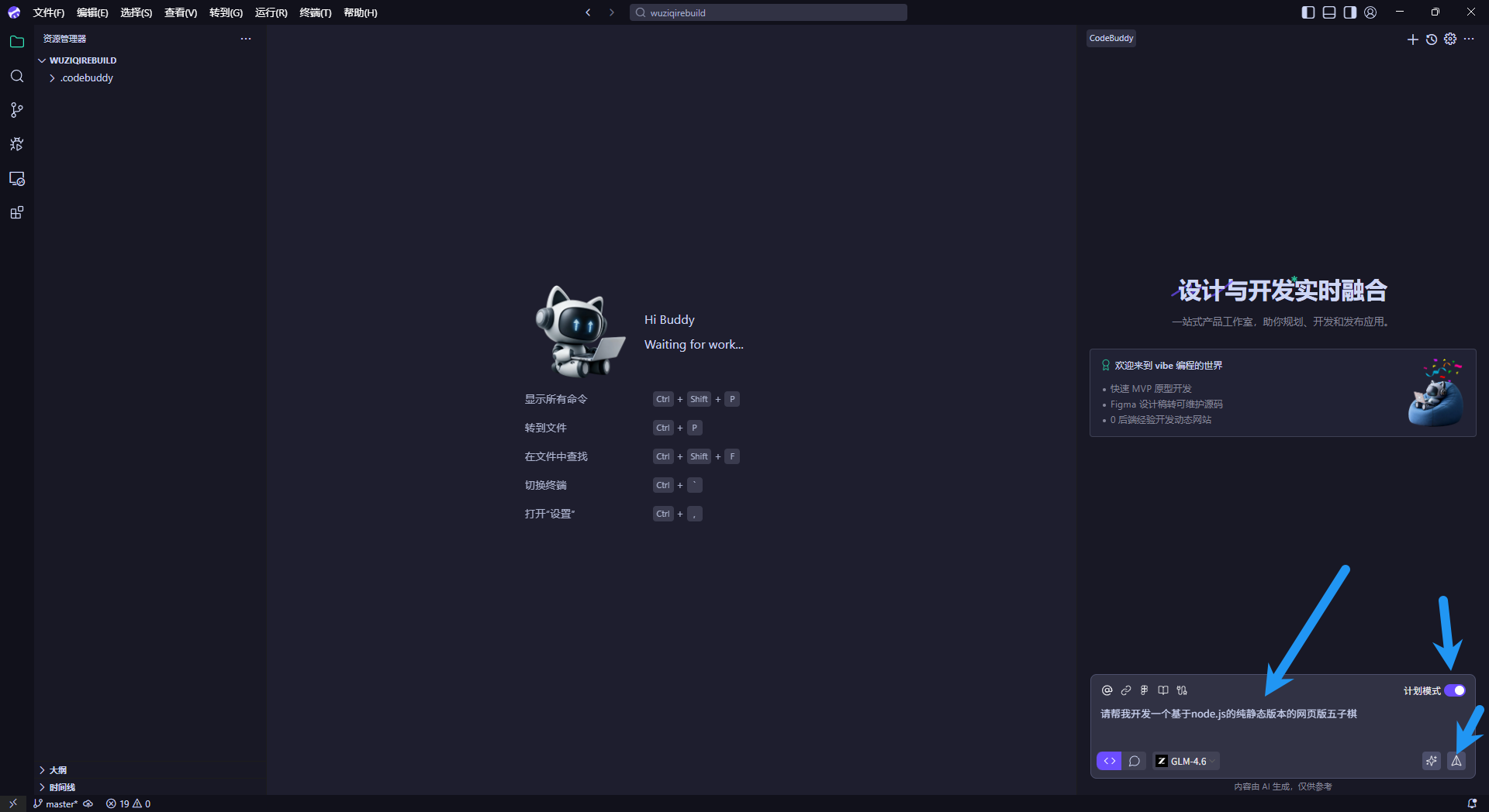 接下来就是告诉AI要写什么了,打开计划模式,我这里给AI发了这样的很简单的提示词(当然,提示词肯定是越详细,越能说明你的需求越好):请帮我开发一个基于node.js的网页版五子棋,然后回车