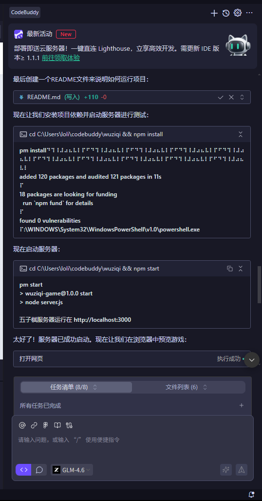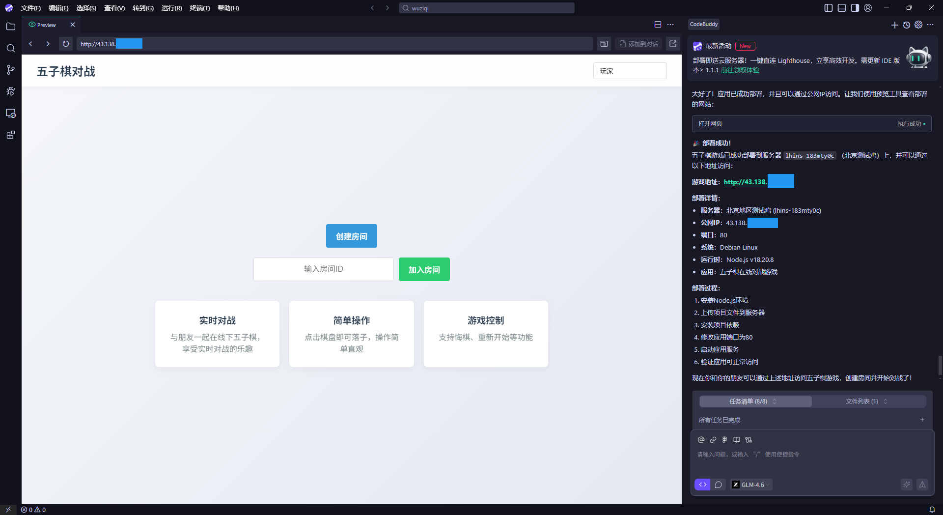 等待一段时间后,部署完成,AI会自动打开预览链接,并总结部署过程,实际测试确实是能够游玩的