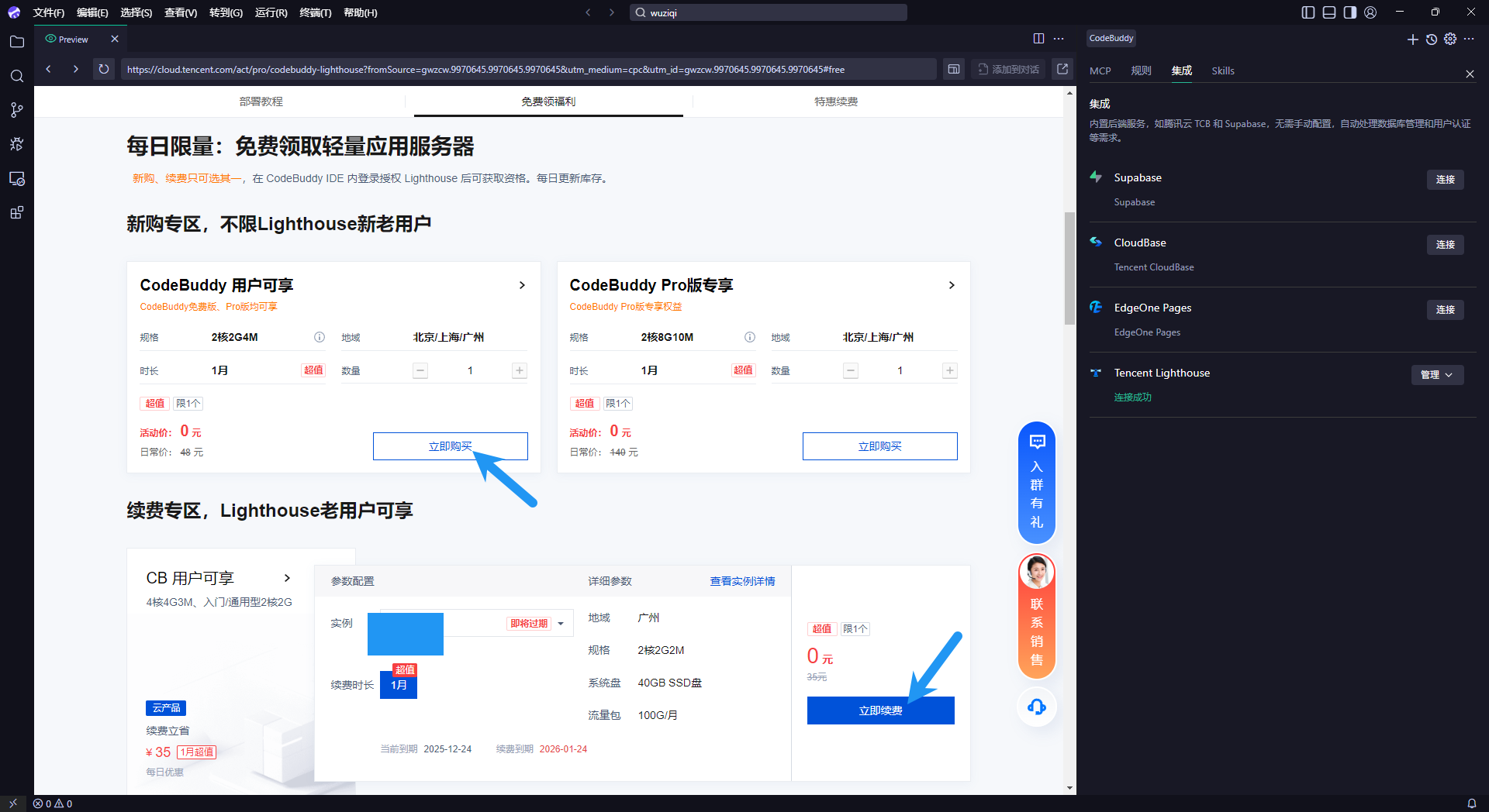 完成 4.1 连接到腾讯云Lighthouse 后,会自动跳转到活动页 https://cloud.tencent.com/act/pro/codebuddy-lighthouse ,点击 立即领取
