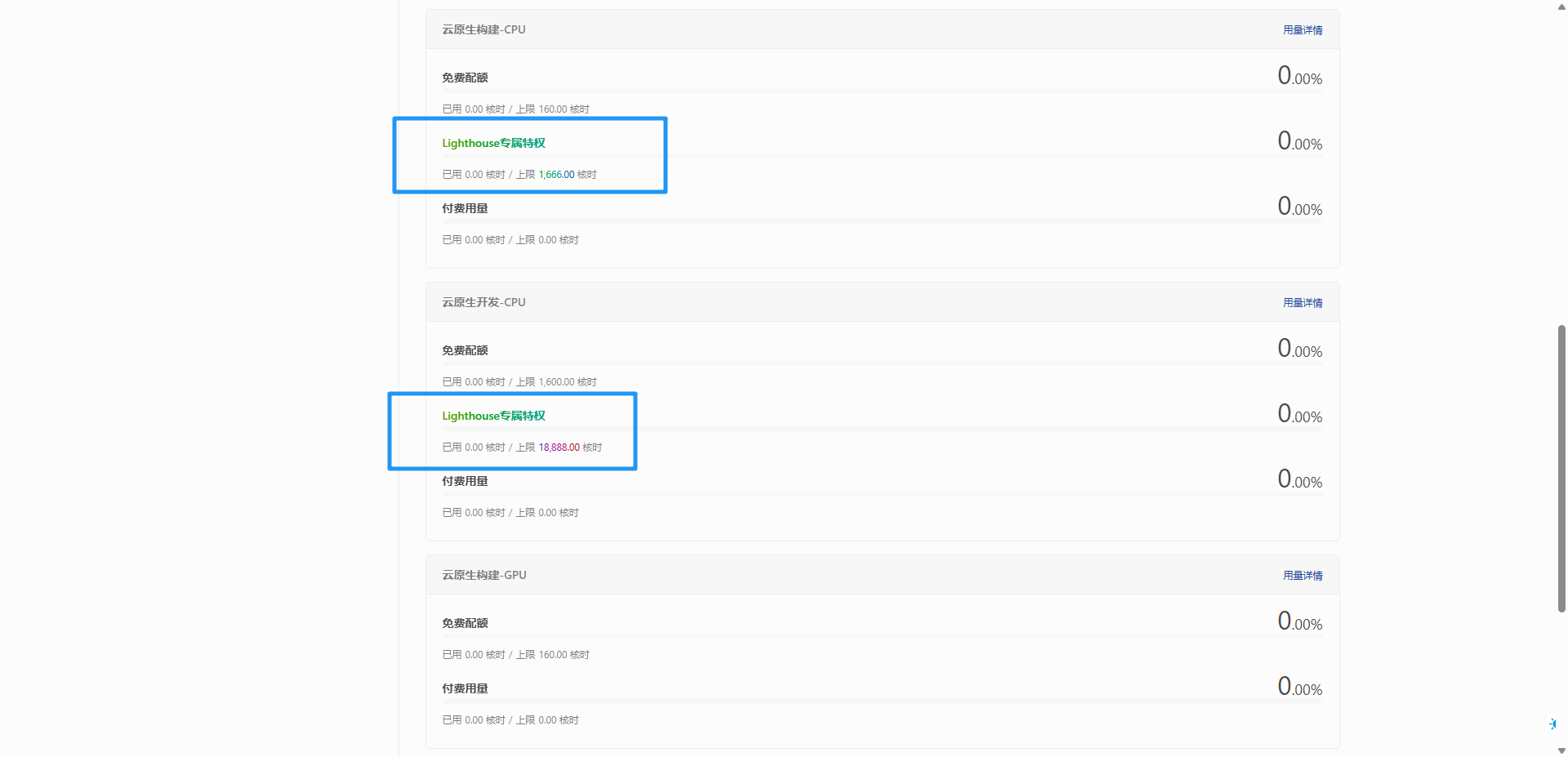 轻量应用服务器用户可免费领CNB专属特权:代码仓库:100GiB;对象存储:100GiB;云原生构建-CPU:1666核时/月;云原生开发-CPU:18888核时/月;特权有效期:永久。填写问卷后将在5个工作日内自动发放;