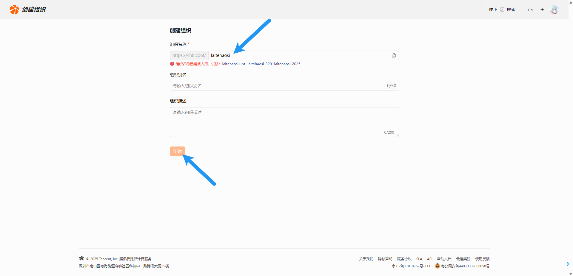 输入你要创建的组织名称,点击创建(我这里已经创建过了,所以显示已经占用)