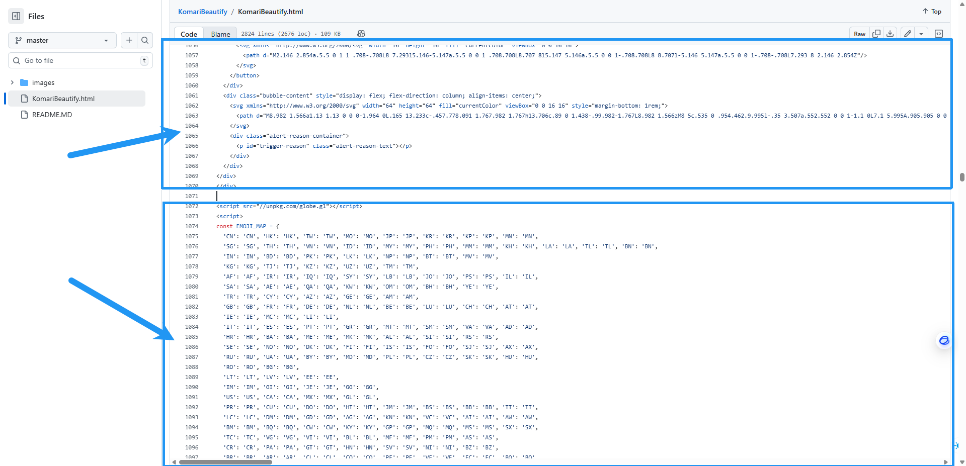 对于KomariBeautify V0.4.2版本,可以翻到第 1071 行,其它版本请自行寻找,上面的全部为CSS/HTML代码,下面的全部为JS代码