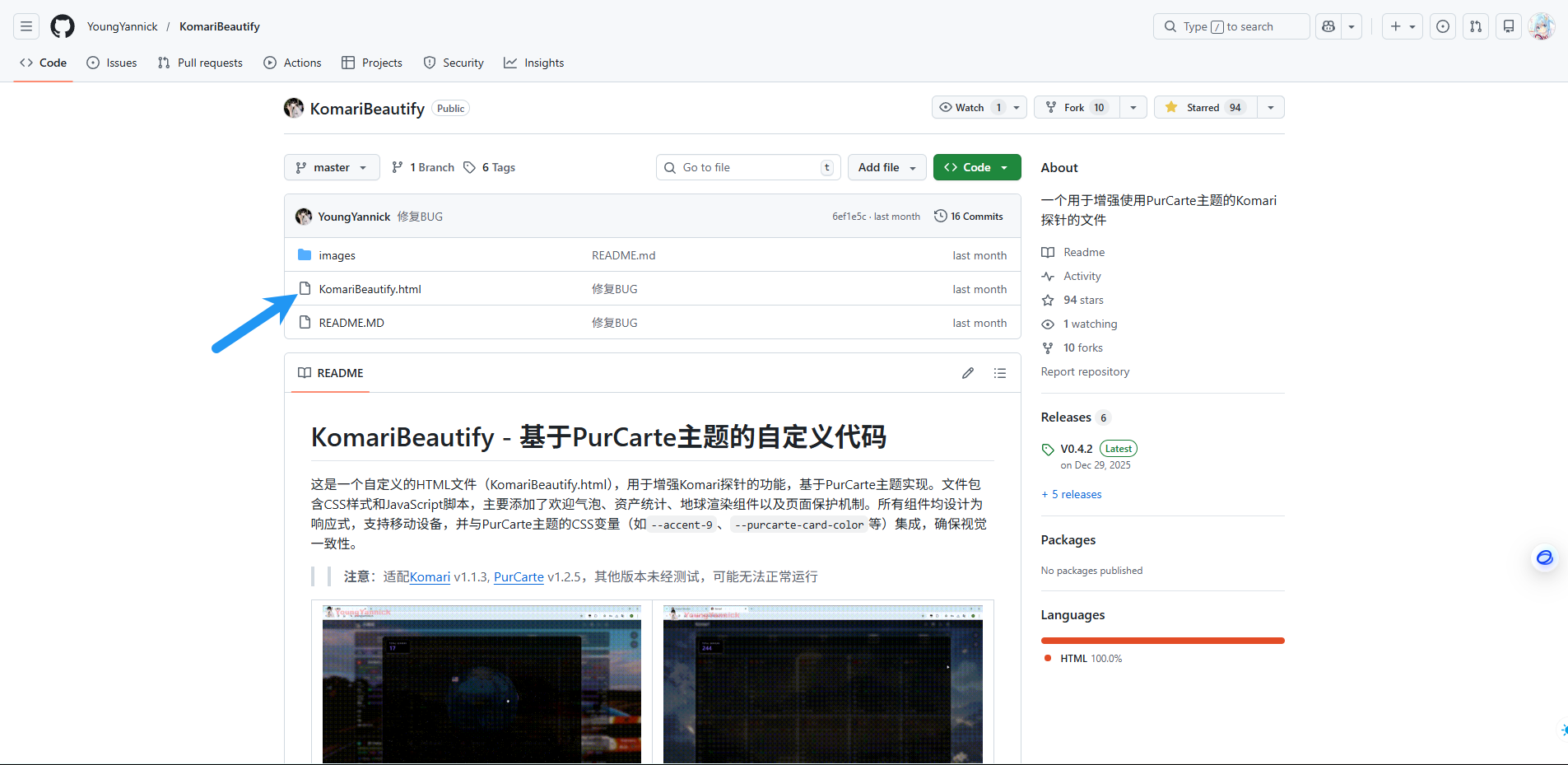 接下来,访问KomariBeautify的github地址:https://github.com/YoungYannick/KomariBeautify