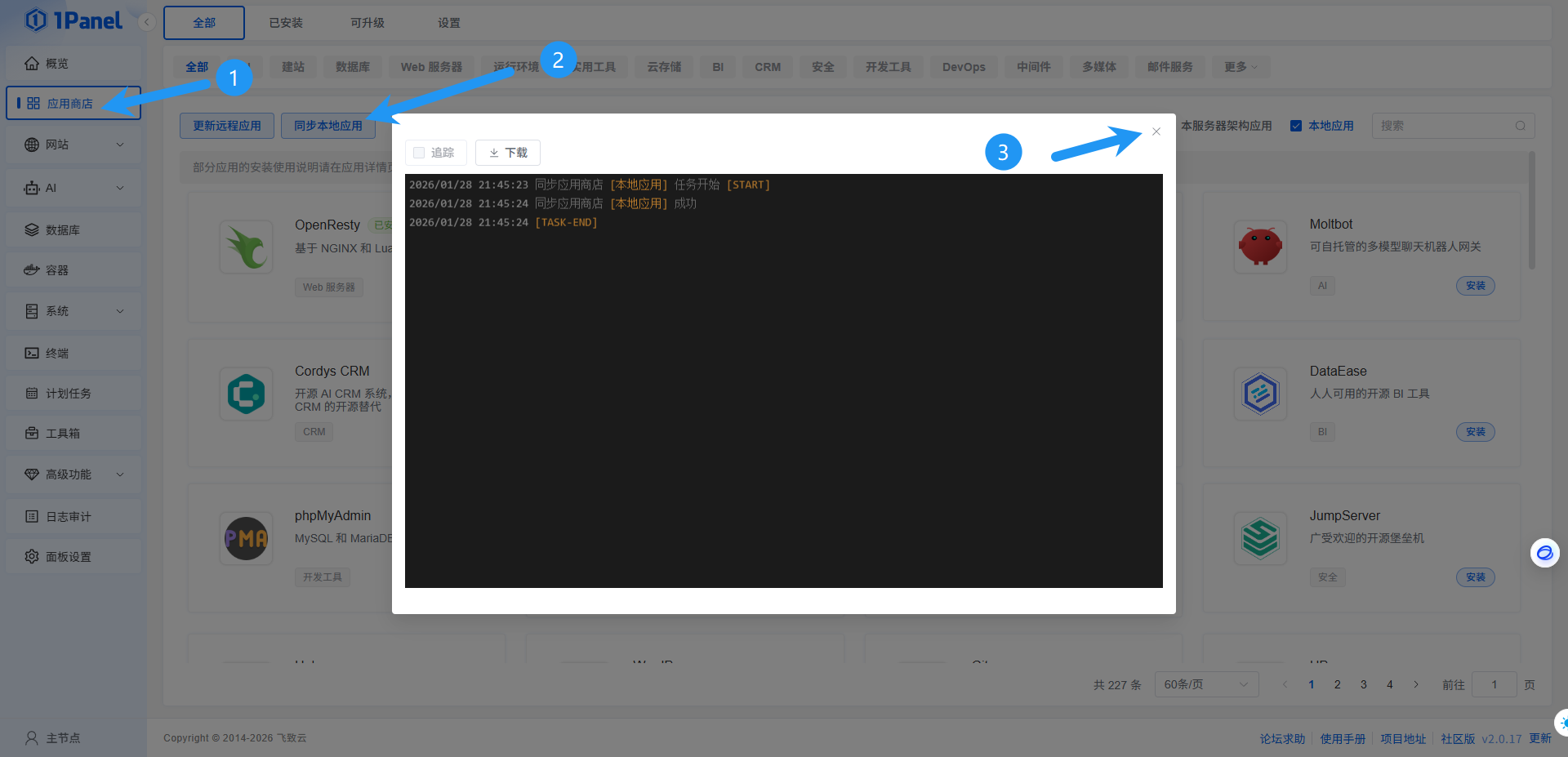 接下来 来到1panel面板,点击 应用商店 - 同步本地应用 然后关闭弹窗