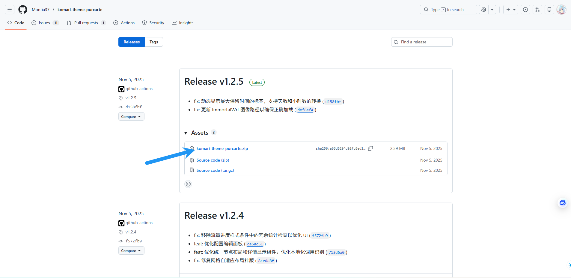 首先,访问releases,下载最新版的主题包到本地 https://github.com/Montia37/komari-theme-purcarte/releases