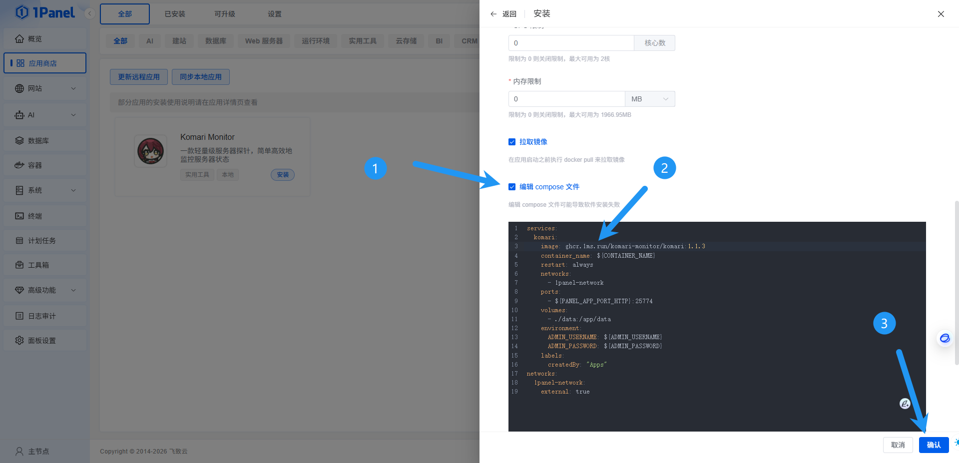 如果你的服务器位于大陆,那么下拉到底部,勾选 编辑 compose 文件 ,然后在下方框内将 ghcr.io/komari-monitor/komari 替换为 ghcr.1ms.run/komari-monitor/komari (1ms.run加速镜像),点击确认