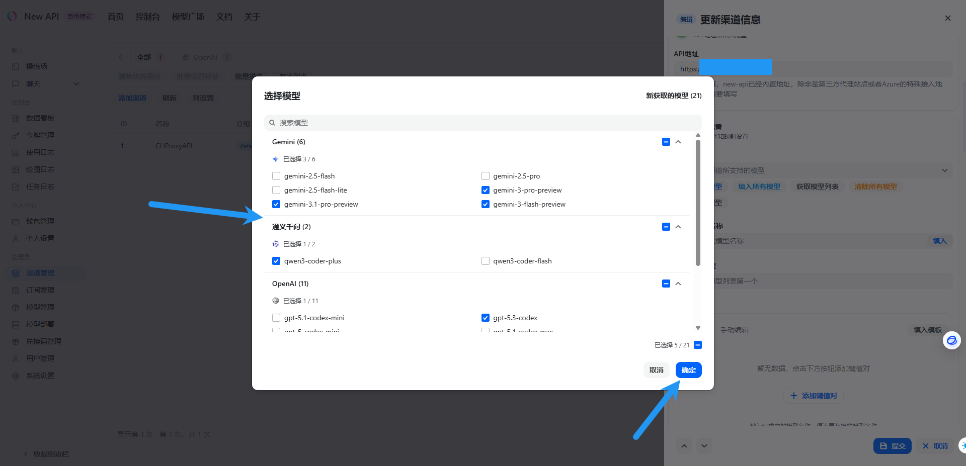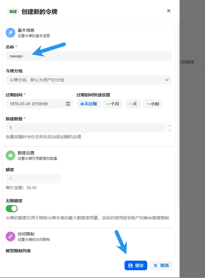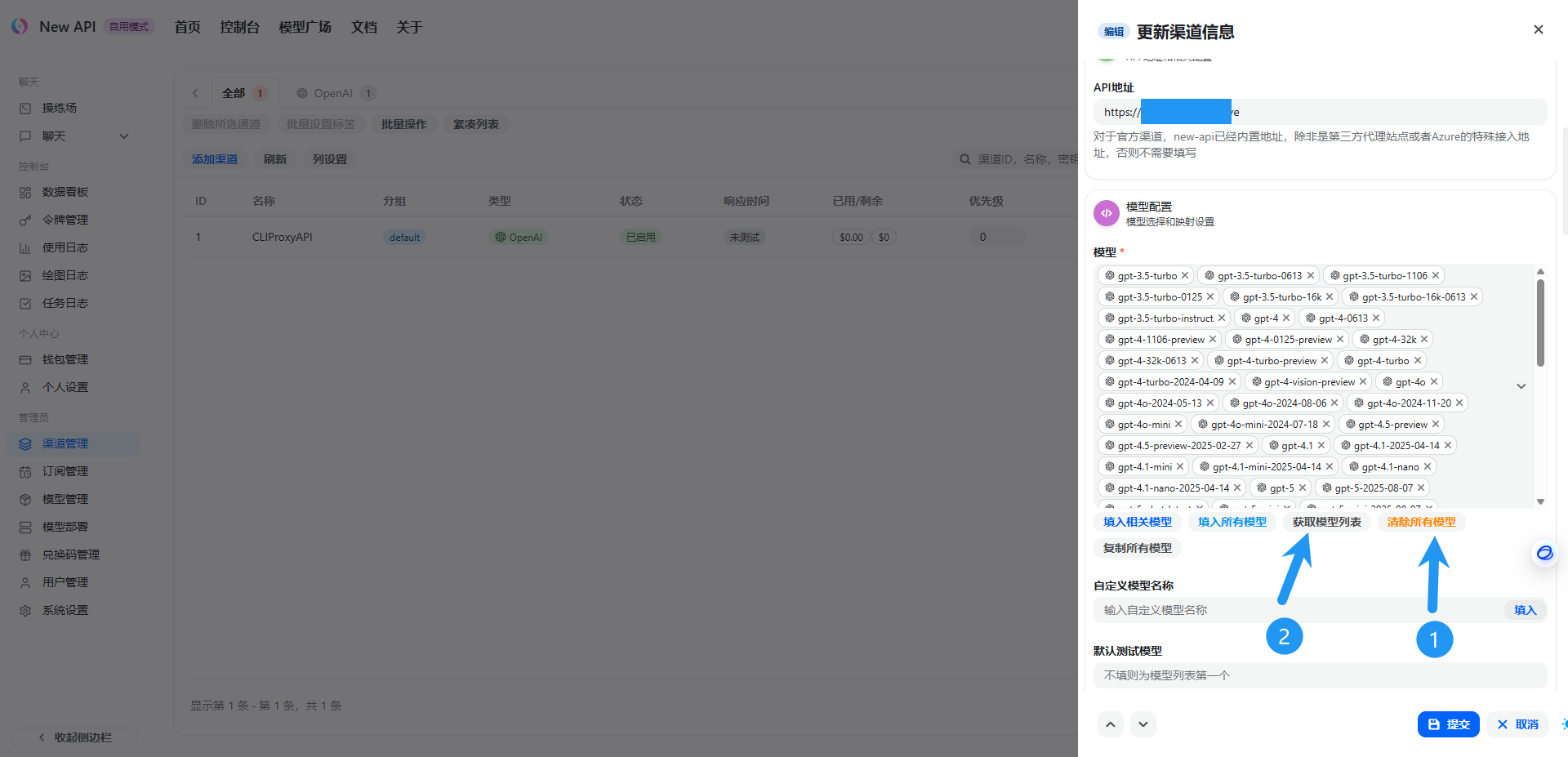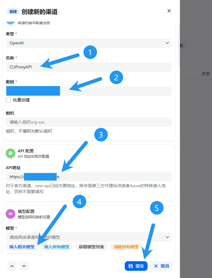 类型默认 OpenAI ,名称随意,填写在CLIProxyAPI配置的密钥,API 地址填写 CLIProxyAPI的服务器IP:端口,或是你反代CLIProxyAPI的域名(一定要注意,地址的最后不要带 / 或者 /v1 ),模型处可以暂时直接点击 填入相关模型 ,点击提交