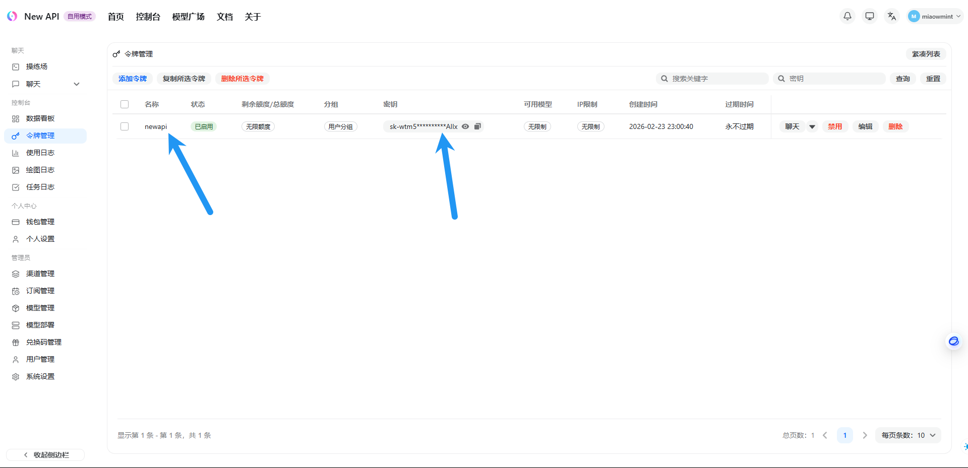 可以看到我们刚刚添加的令牌,点击密钥处可以查看或复制 API 密钥
