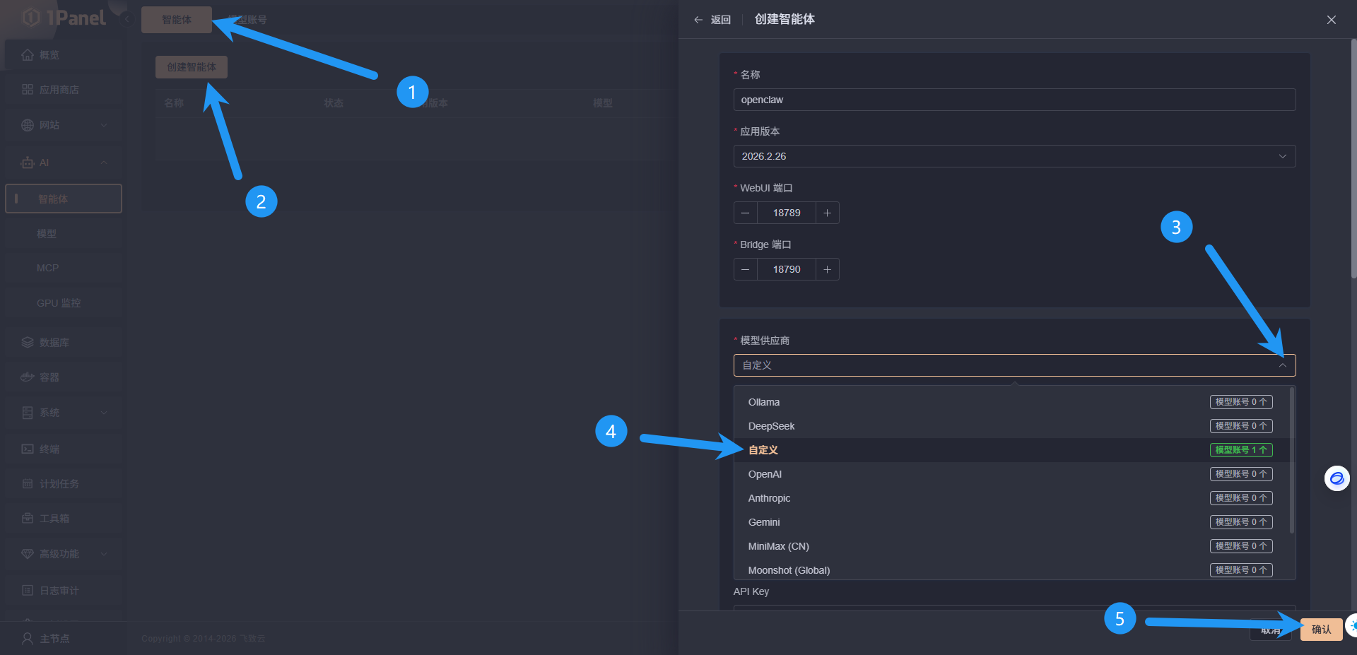 点击智能体,点击创建智能体,点击下拉模型供应商,选择自定义,点击确认