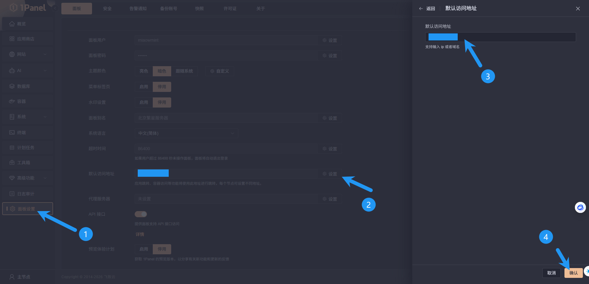 接下来点击面板设置,点击默认访问地址的设置,填入自己服务器的 IP ,点击确认