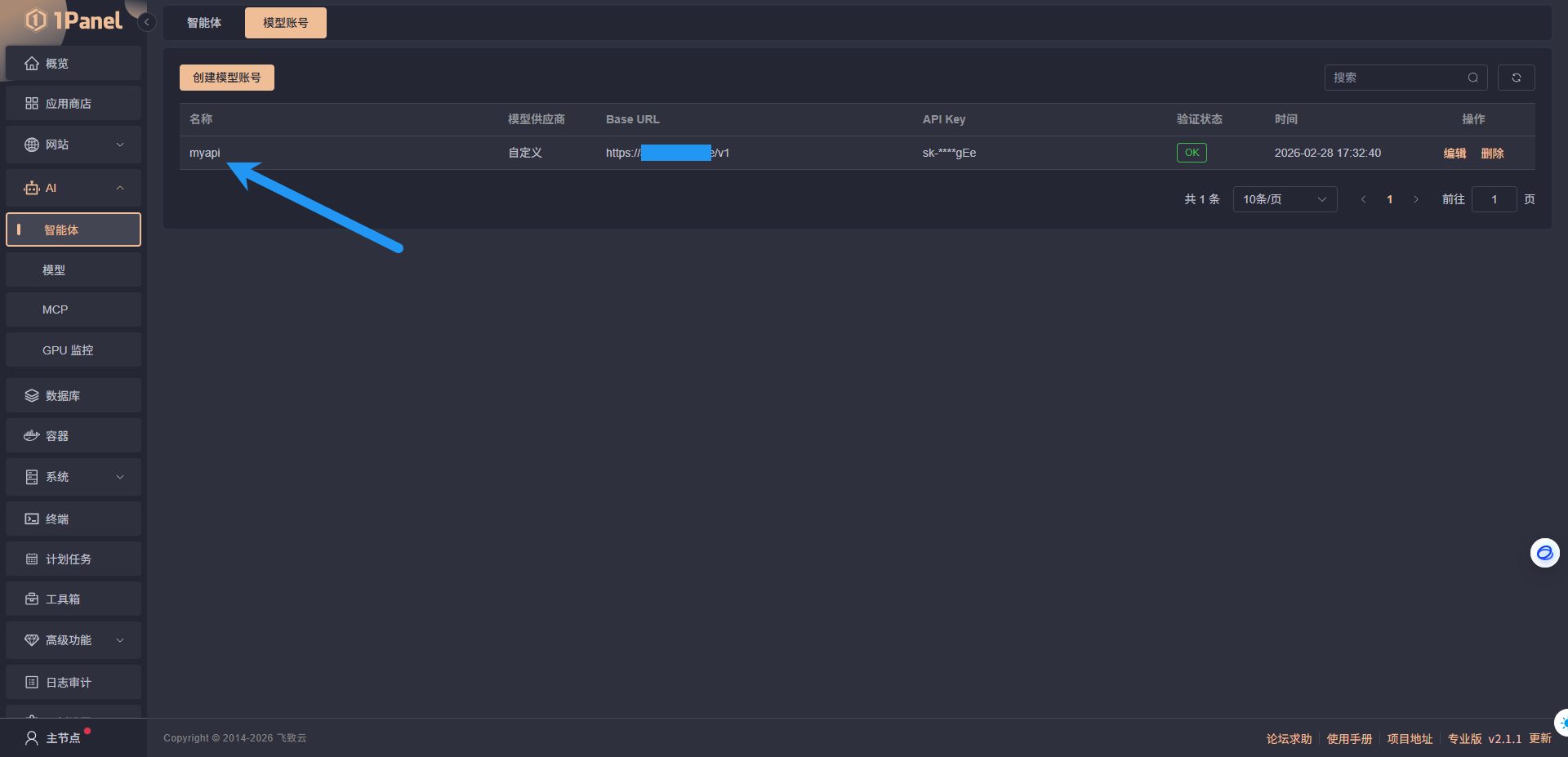 进入 1Panel 面板,点击 AI 下拉,点击智能体,点击模型账号,点击创建模型账号