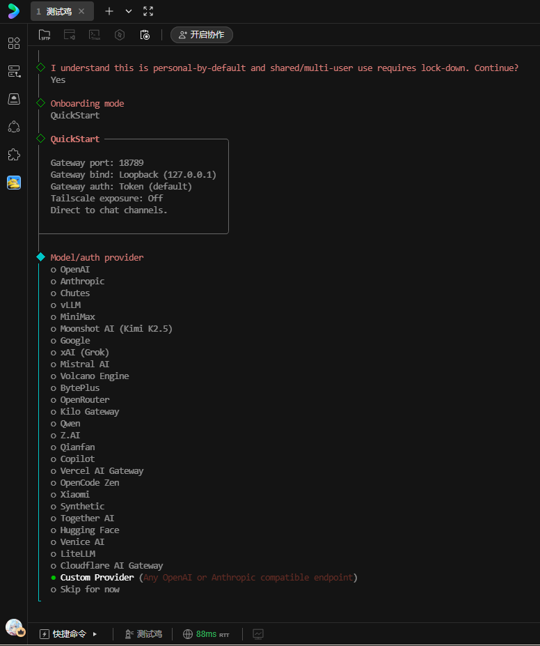 接下来要接入大语言模型,选择 Custom Provider ,回车(这里我要使用的是前面教程反代出来的自建 API,如果你有其他官方 API,也可以在此处接入,这里不做赘述)