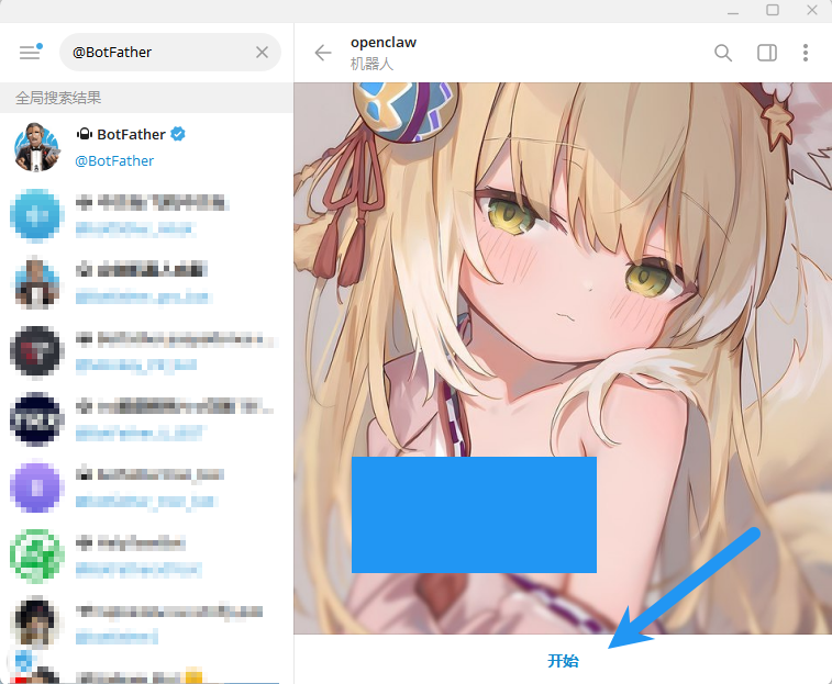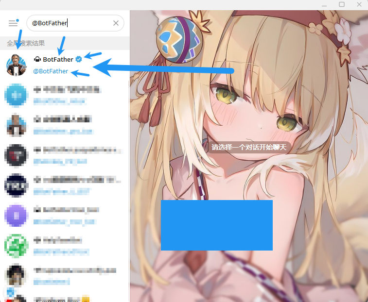 点击这个名为 BotFather 的机器人(一定要看好是用户名为 @BotFather 并且带官方认证的这个)