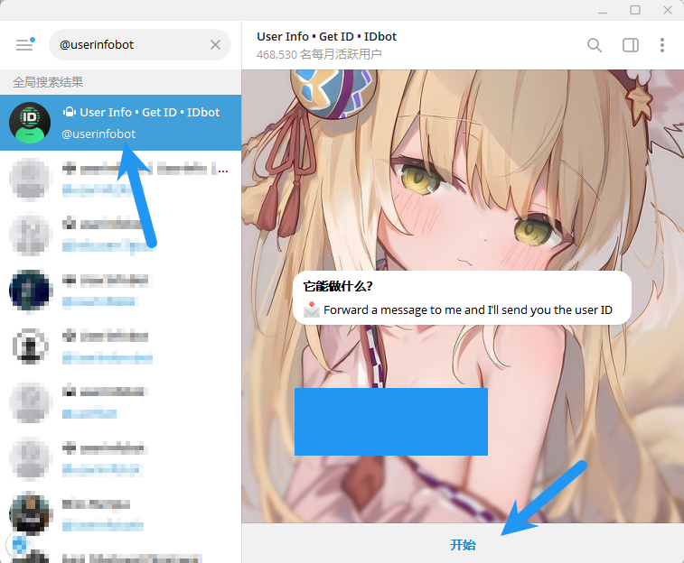 搜索 @userinfobot ,确认好用户名,点击机器人,点击开始