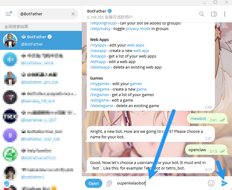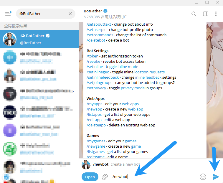 无需理会机器人发了什么,输入 /newbot ,点击发送
