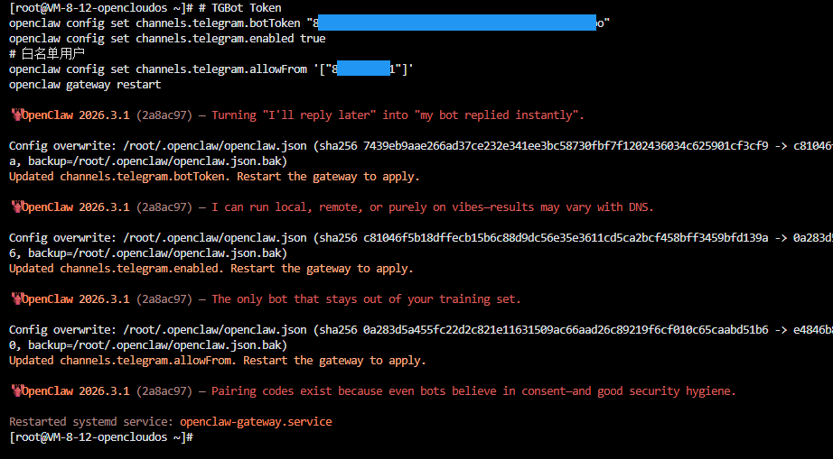 openclaw gateway restart可以看到,TG通道已经添加成功了