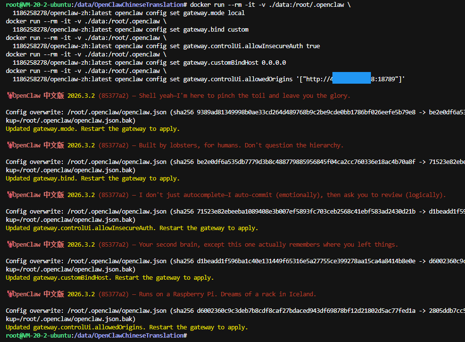 1186258278/openclaw-zh:latest openclaw config set gateway.controlUi.allowedOrigins '["http://0.0.0.0:18789"]'如图