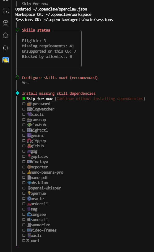 询问我们是否要确认技能,回车,可以看到有很多 skills ,可以挑选自己觉得有用的使用空格键启用(本文也直接跳过),选择完成后 回车 以提交