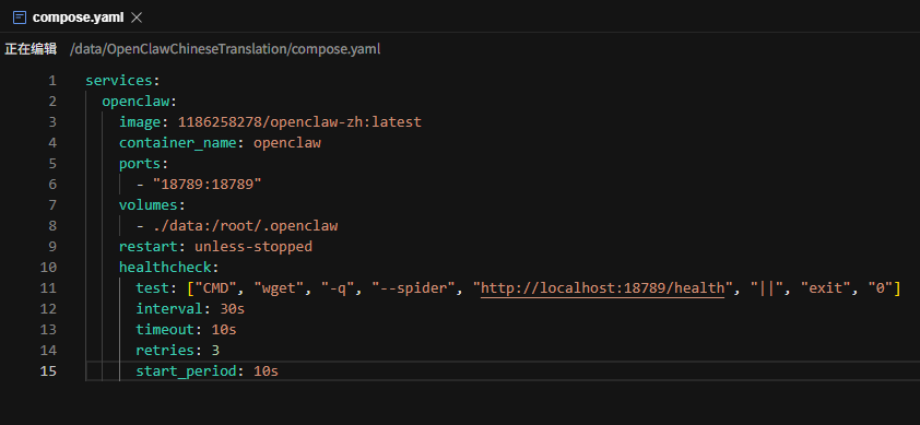 在/data/OpenClawChineseTranslation下创建 compose.yaml 文件