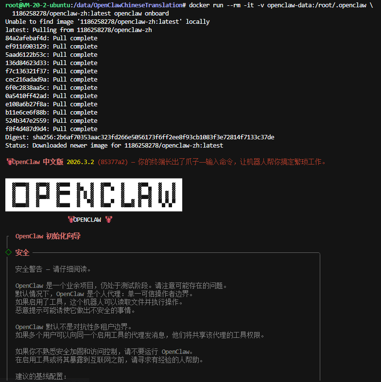1186258278/openclaw-zh:latest openclaw onboard可以看到,拉取完镜像以后,进入了初始化向导