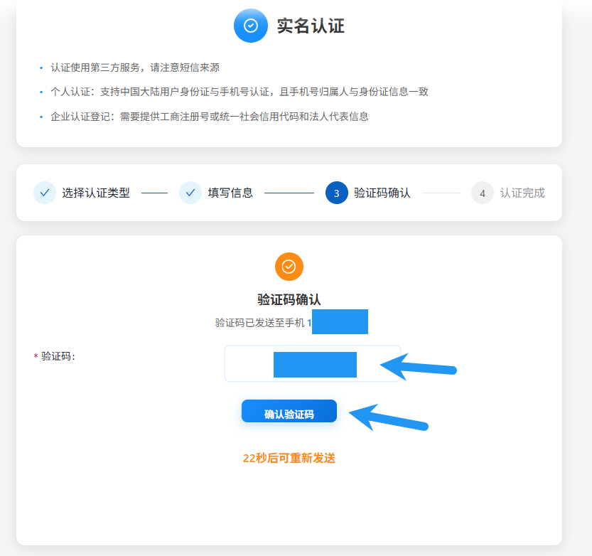 填入收到的验证码,点击确认验证码