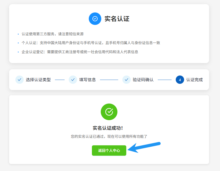 认证成功,点击返回个人中心