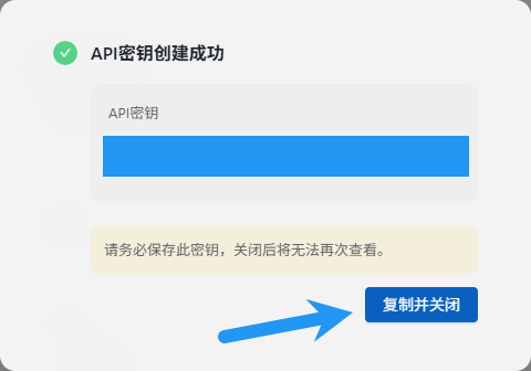 点击复制并关闭,保存好APIKEY