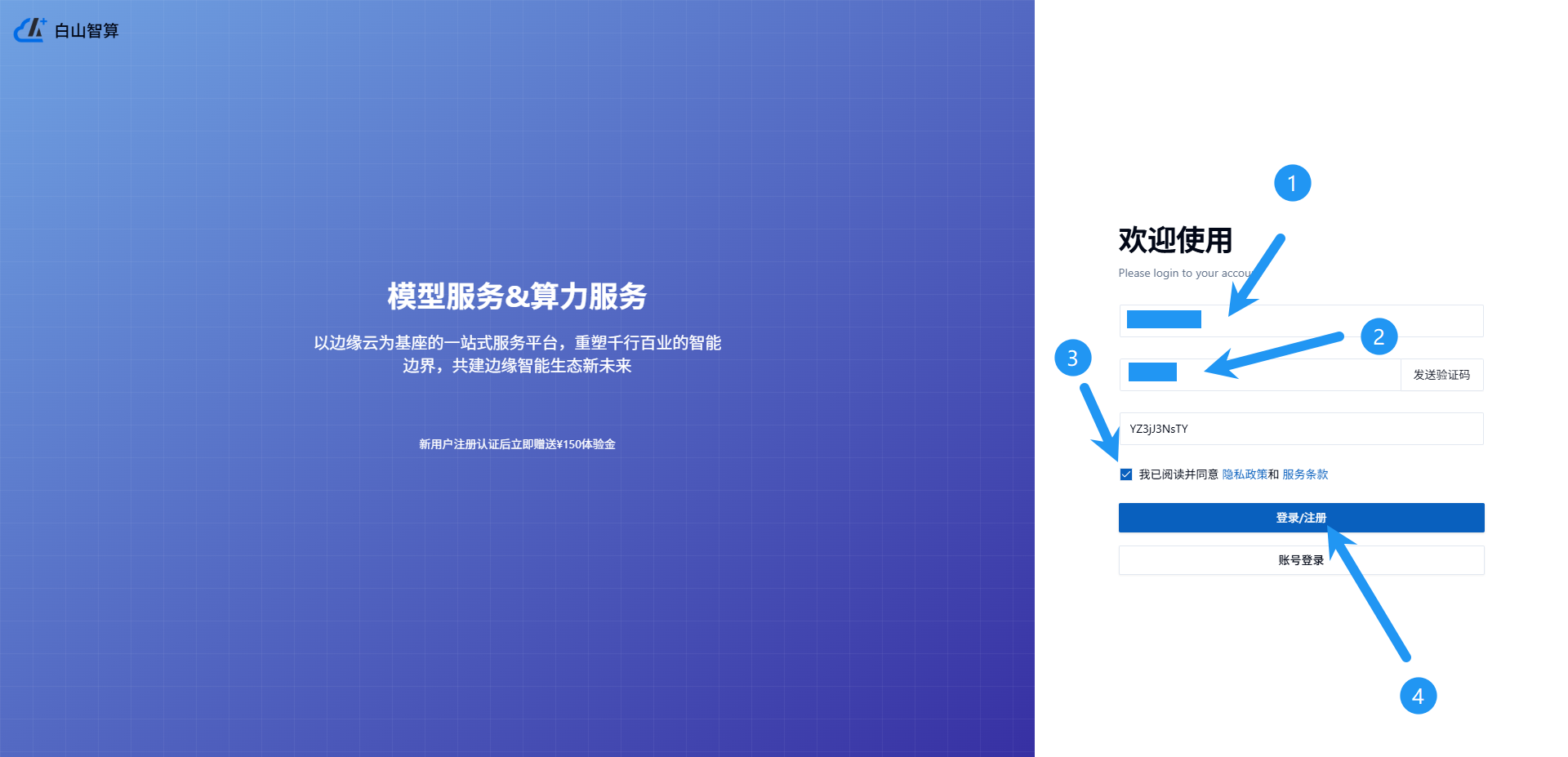 输入手机号,获取验证码并填写,勾选条款,点击登录/注册