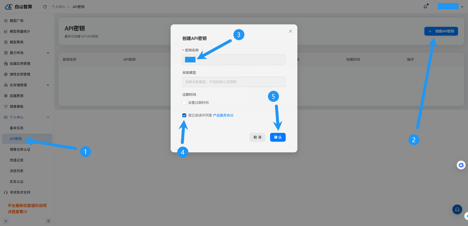 点击API密钥,点击创建API密钥,密钥名称随意,勾选同意,点击确认