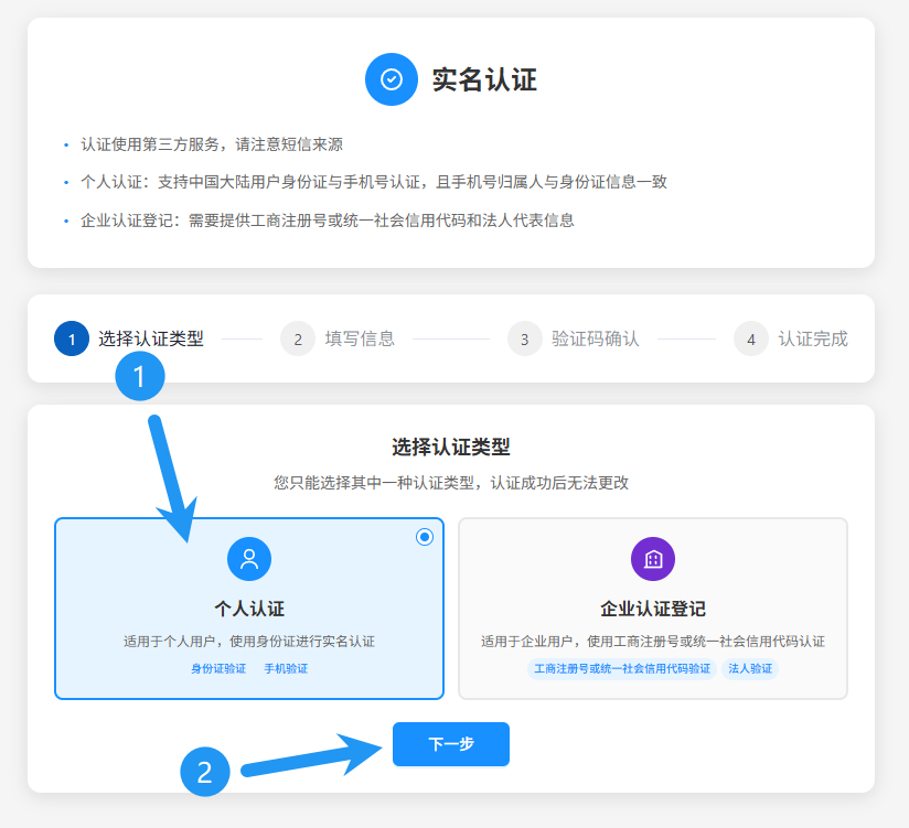 点击个人认证,点击下一步
