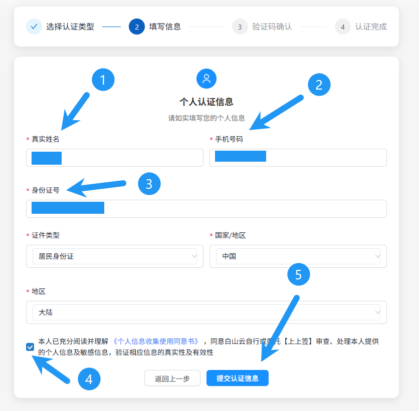 输入自己的姓名、手机号和身份证号,勾选同意,点击提交认证信息