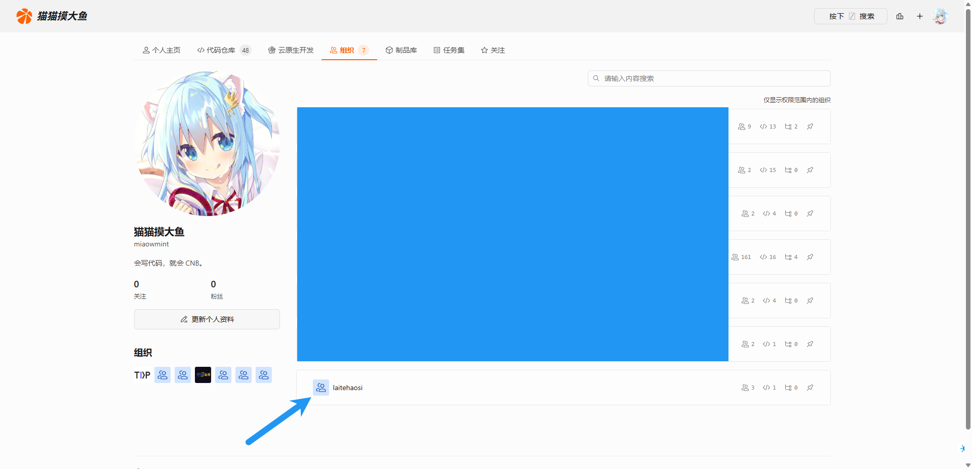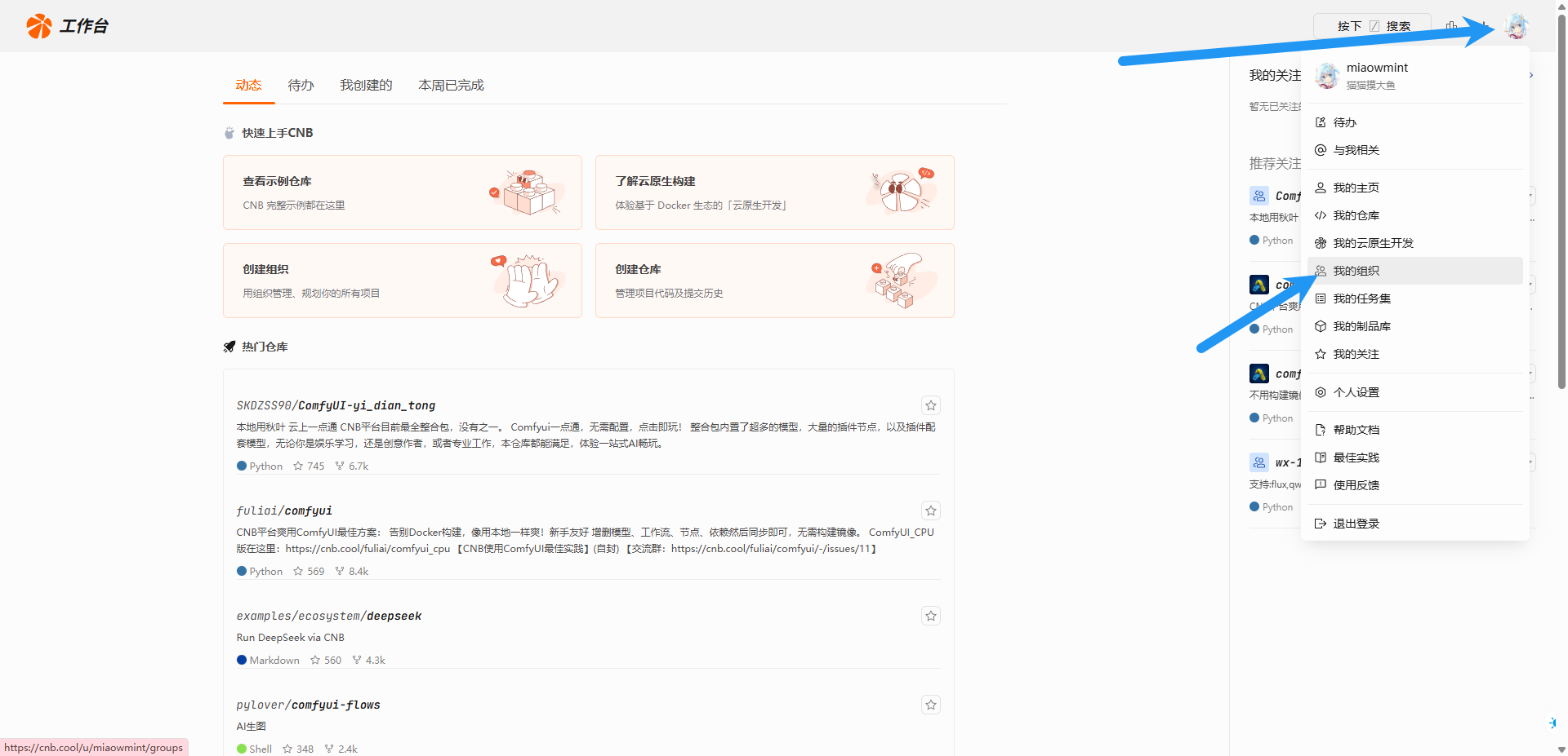 继续等待 1~5 个工作日后,访问 https://cnb.cool/ ,点击右上角头像,点击我的组织