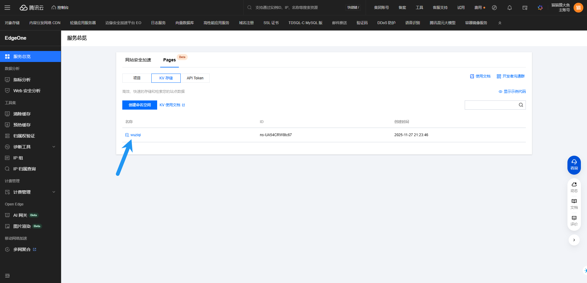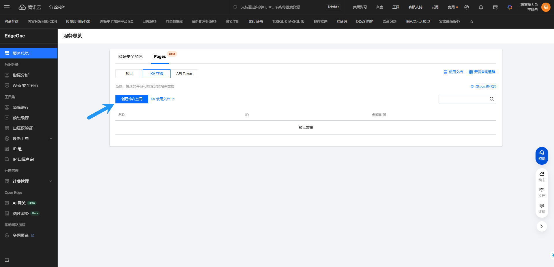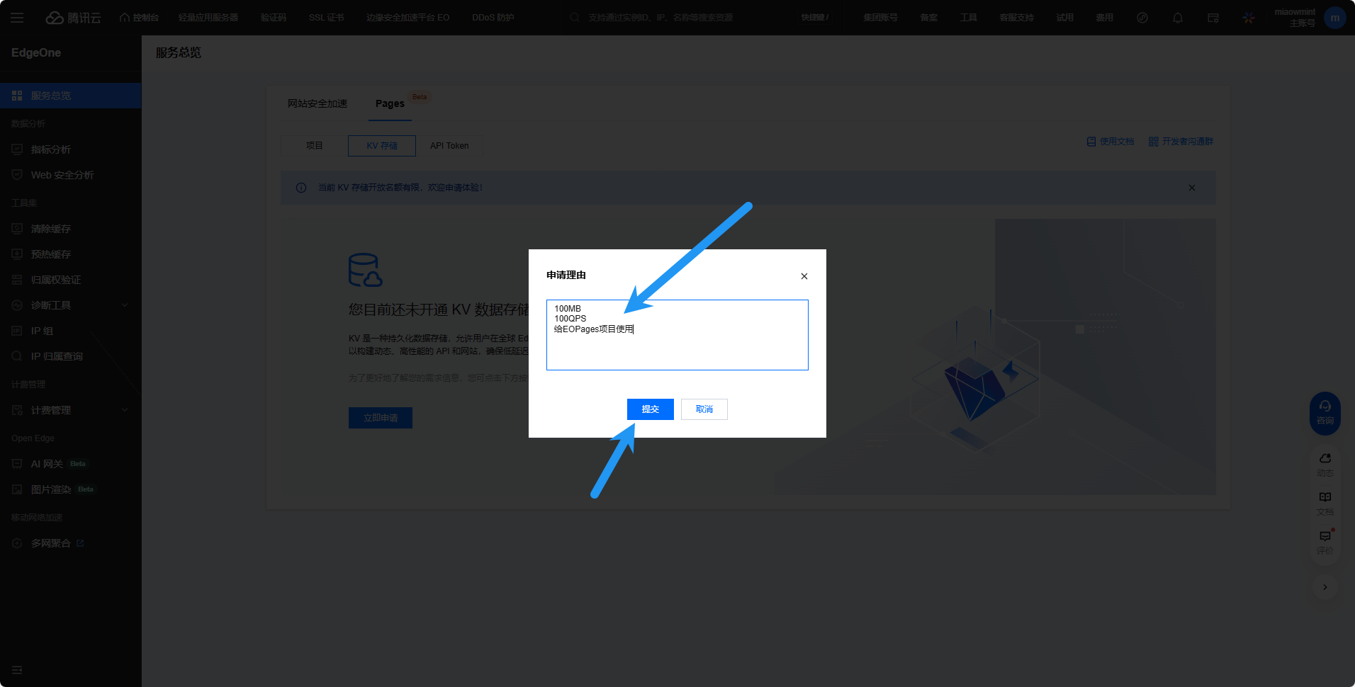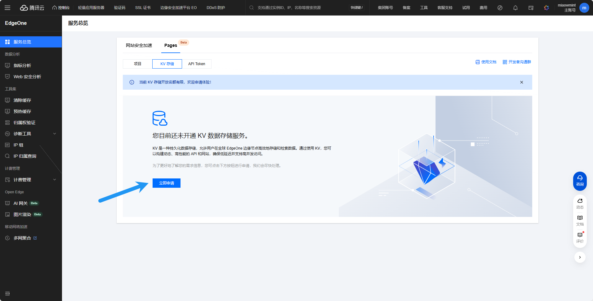 访问 https://console.cloud.tencent.com/edgeone/pages?tab=kv ,点击立即申请