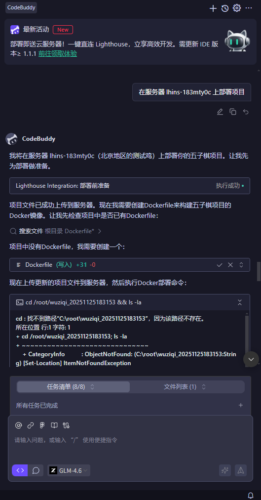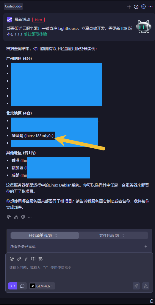 将刚刚复制的服务器ID交给AI,对AI发送 在服务器 lhins-183mty0c 上部署项目 (实践中请替换成你自己的服务器ID)