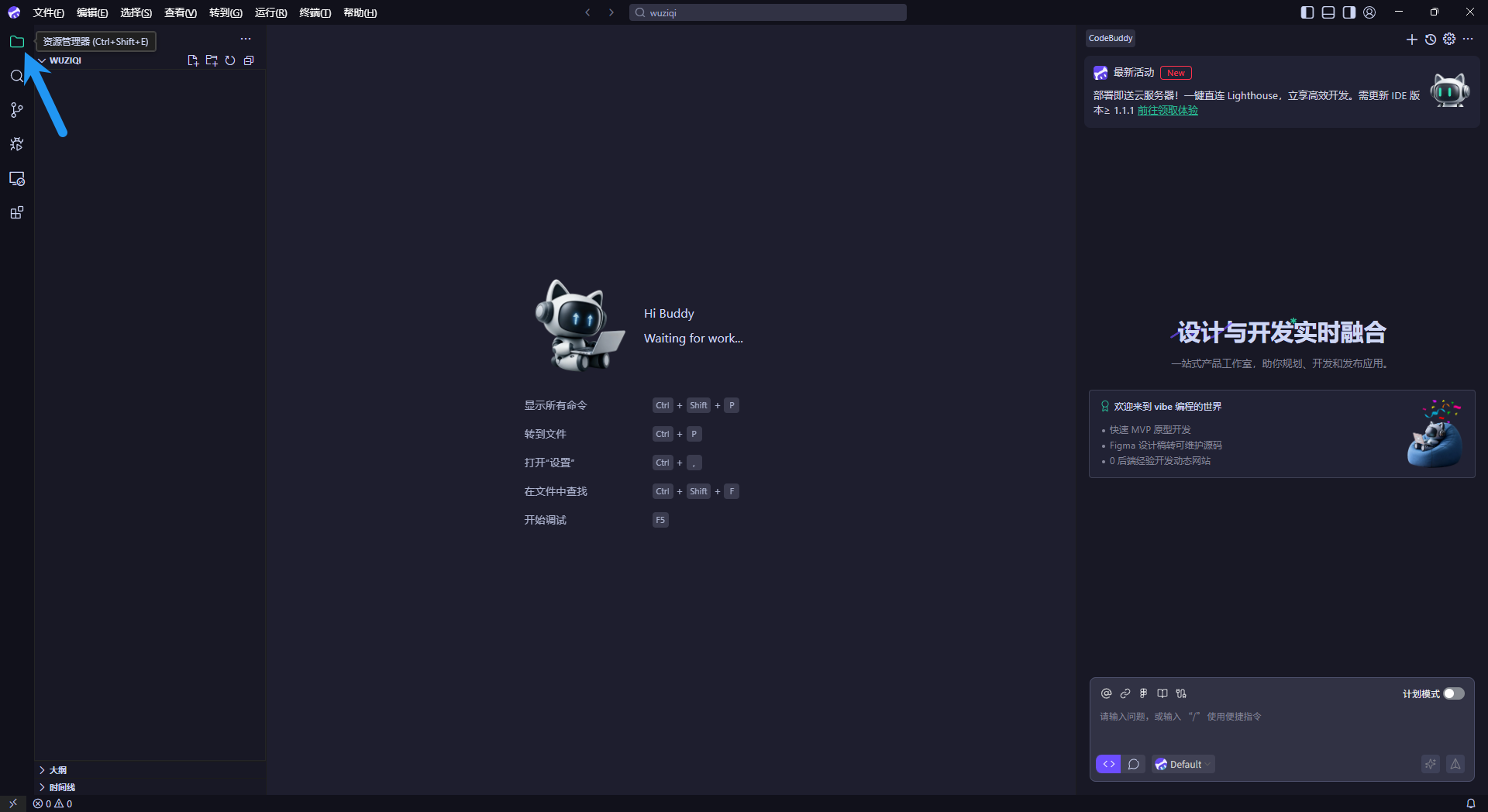 点击资源管理器,可以看到,我们已经在刚刚新建的项目目录里了