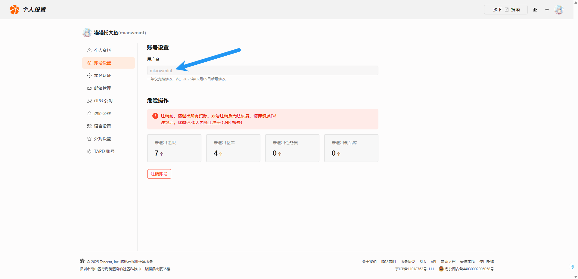 访问 https://cnb.cool/profile/account ,如图所示处就是用户名;如果你没有设置用户名,请务必设置一个,这是后面的步骤必需的
