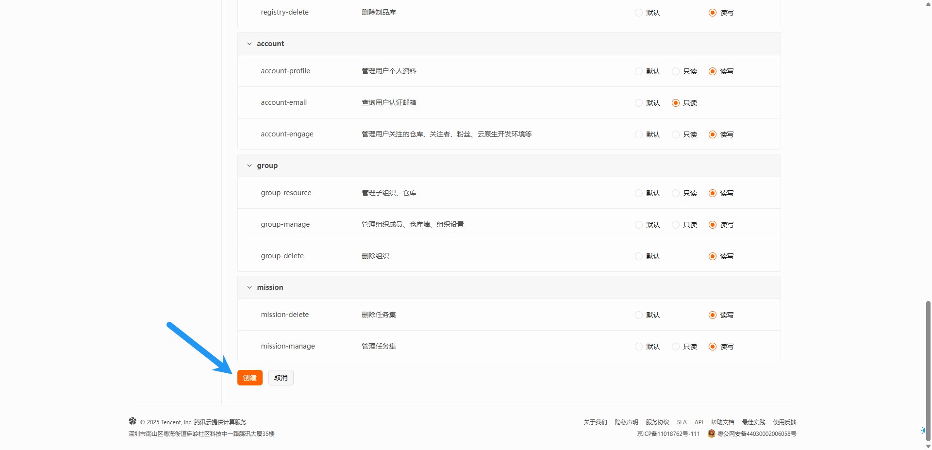输入令牌名(随意),点击 MCP读写凭据(这样的密钥是全权限的,如果有权限方面的顾虑,可以根据自己的实际情况,精细化调整使用范围及下方的授权范围)